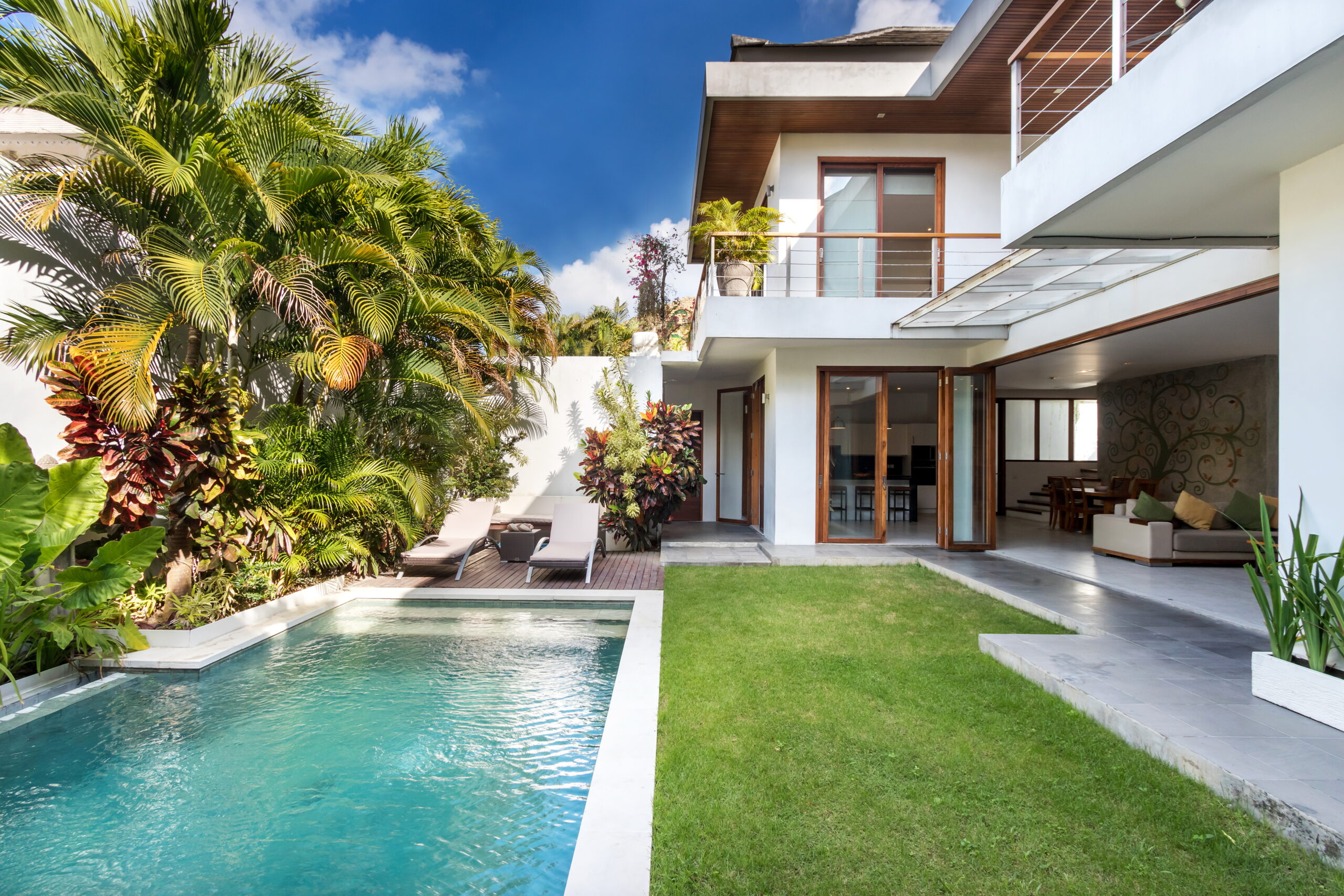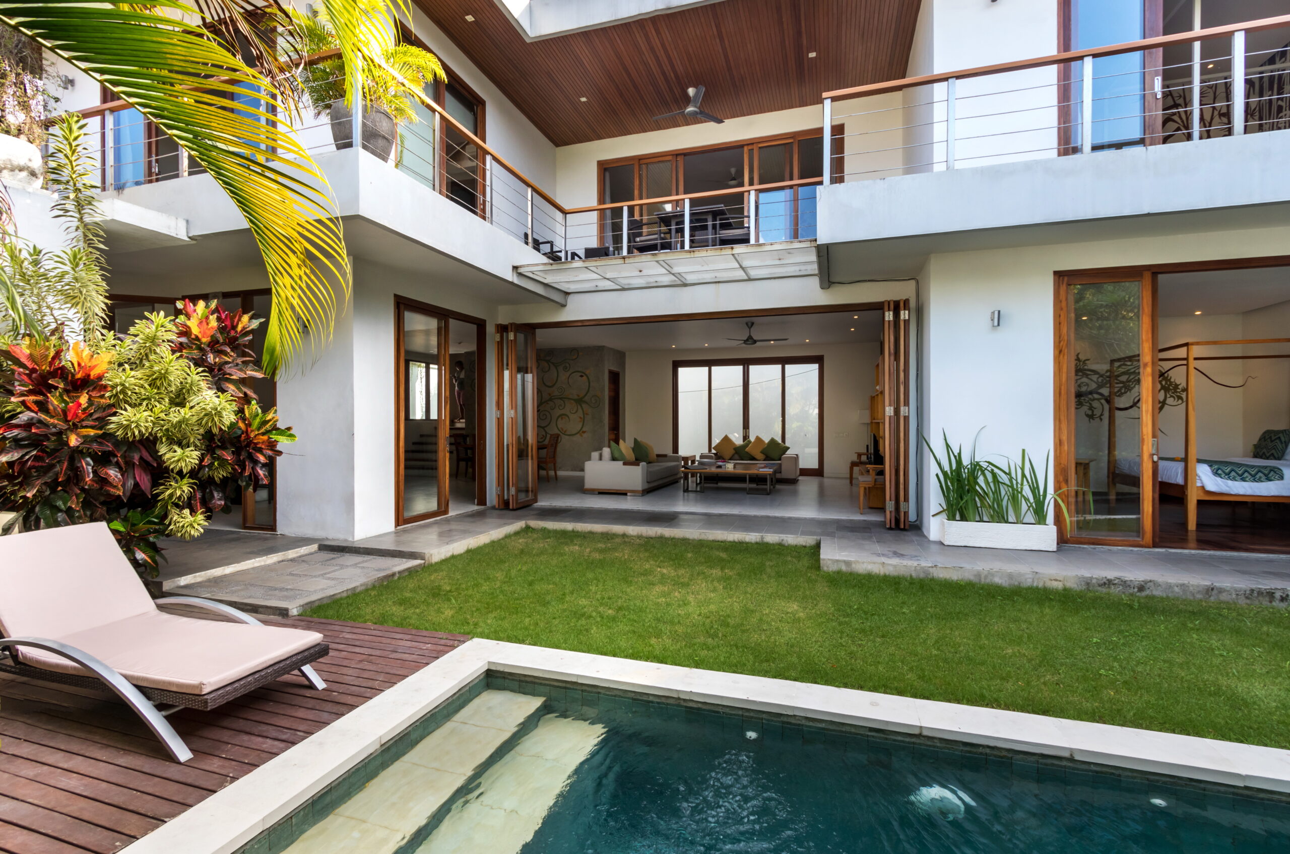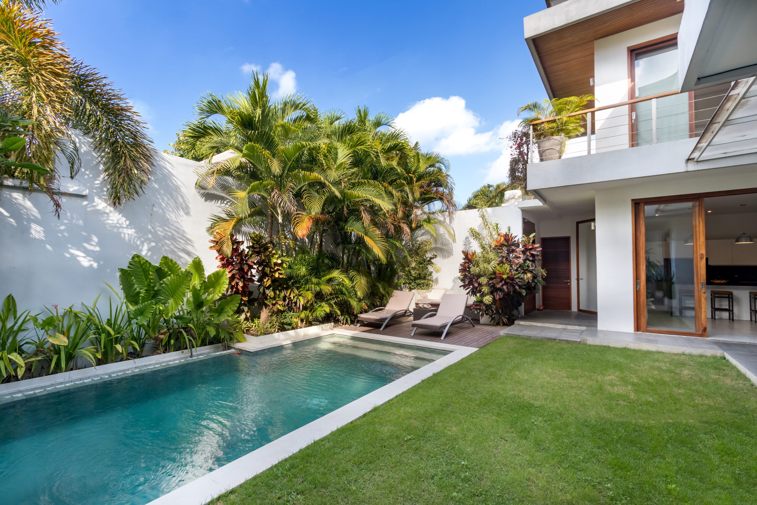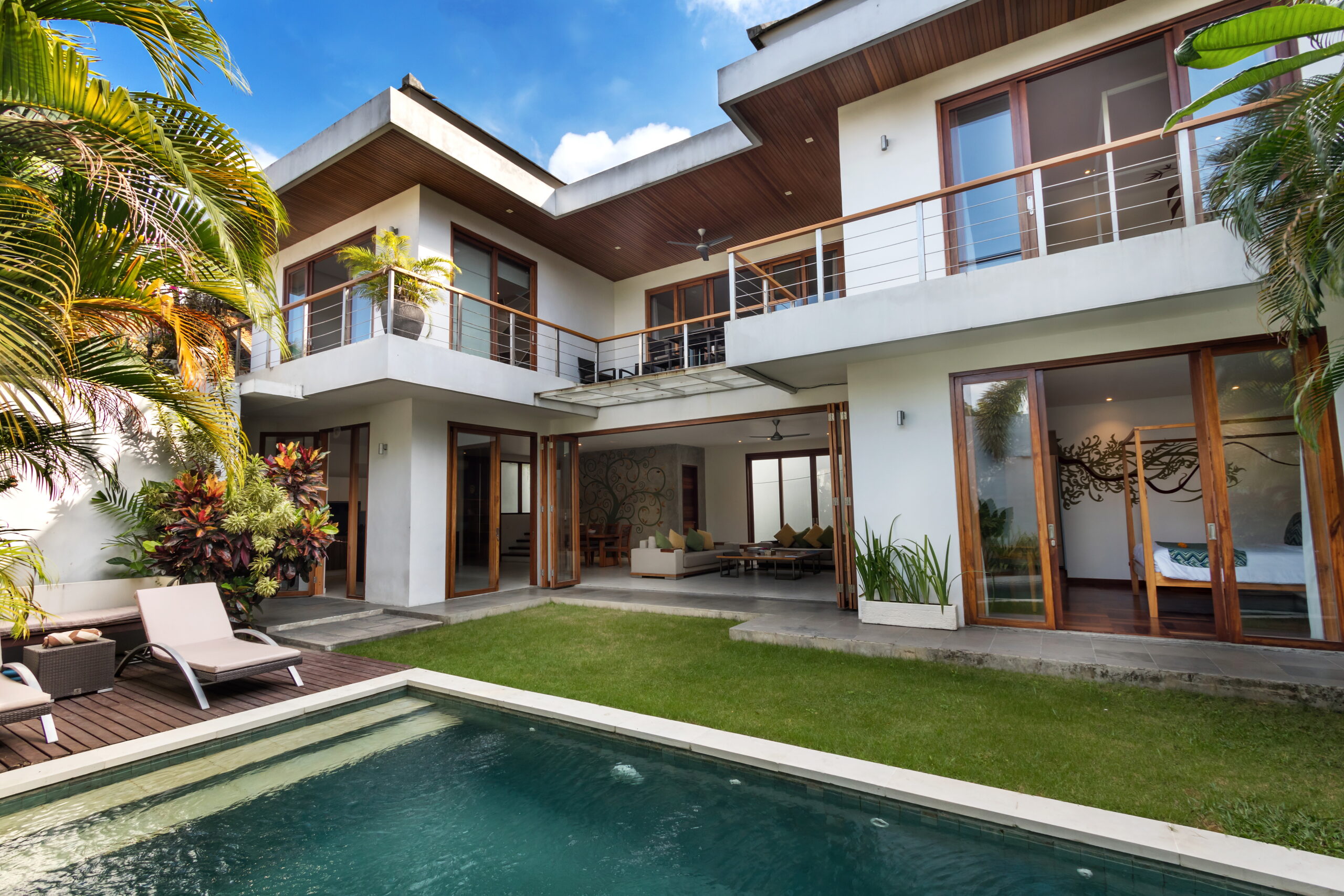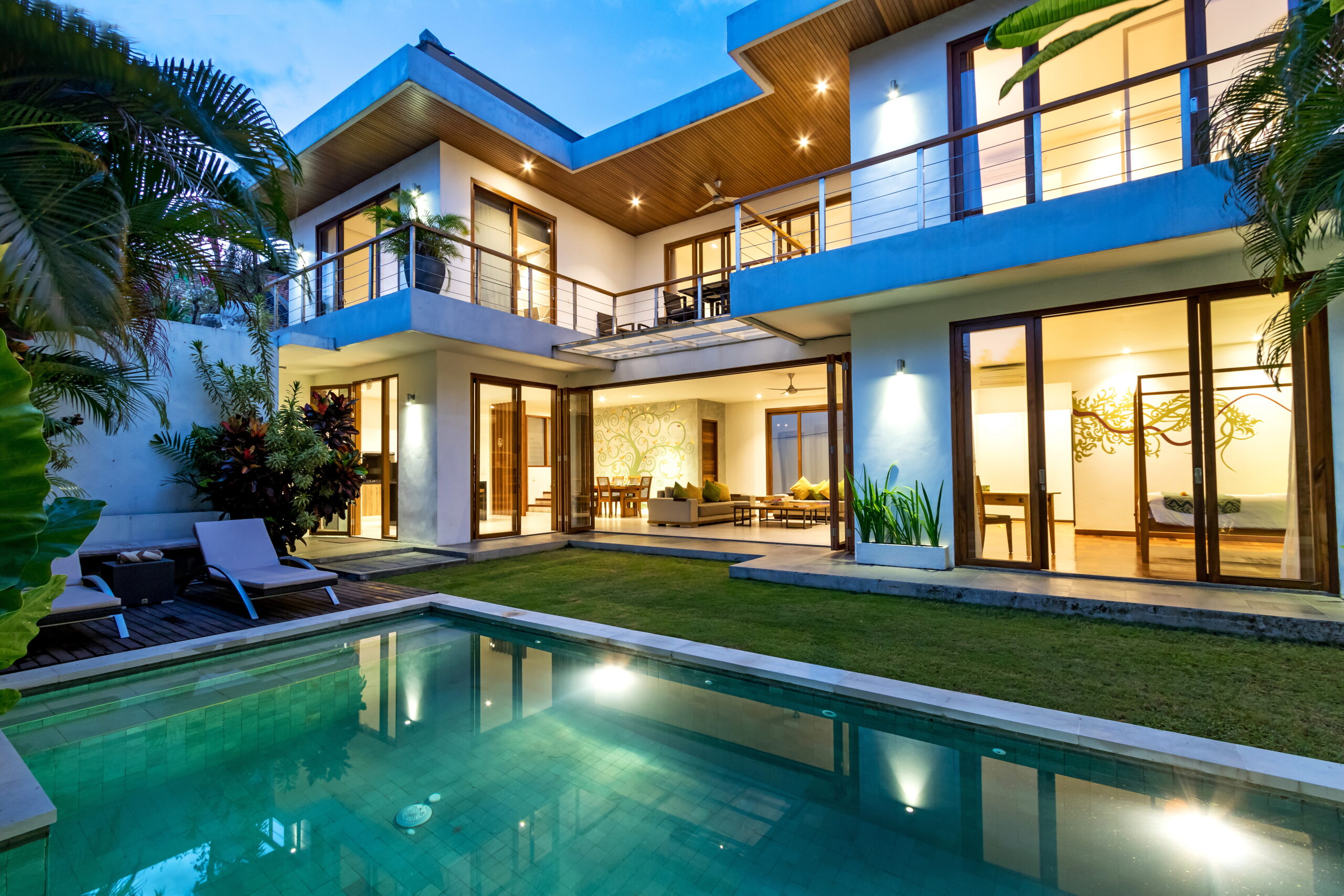 Casa Cinta 1 is a gorgeous 3-bedroom luxury villa, located just meters away from the beach in Batu Belig, a quiet area located strategically in between Seminyak and Canggu. The villa features a grand, modern, double-storey pavilion with a spacious, air-conditioned living room and three comfy villa suites. The most striking thing about Villa Casa Cinta 1 are the beautiful wall paintings made by Italian artists. They are handmade, unique and they give this villa character a unique character. Next door, you will find Villa Casa Cinta 2 – the 3-bedroom twin sister of Casa Cinta 1 and they can be rented out together for larger traveling groups. The interior design is of Villa Casa Cinta 1 is chic and contemporary. There is a lounge/entertainment corner, a dining area and a well-equipped state-of-the-art kitchen. From the comfy cushioned sofas, you can sit back to enjoy the garden view (in air-conditioned comfort that is!), or you can watch movies on the flat-screen cable TV with 60 international channels. A stack of DVDs and board games are provided for endless family fun. The timber dining table for 6 stands on an oriental carpet, next to a floor-to-ceiling mural painting of a tree. The chic, contemporary kitchen comes with a bar and 3 stools to sit and have coffee in the morning, beers in the afternoon and cocktails in the evening. The air-conditioned living room is easily configured into a tropical open-plan living space, giving almost direct access to the pool and the long chairs under the sun. Up on the first floor, there is another lounge area, furnished with a pull-out sofa-bed and a library of books. The walled garden is tropical as can be, featuring green foliage growing lushly by the side of the crystal clear, glistening swimming pool. The waterfall feature tops it off. The sound of rippling water certainly ads to the tranquil ambience of this luxury oasis of Batu Belig.