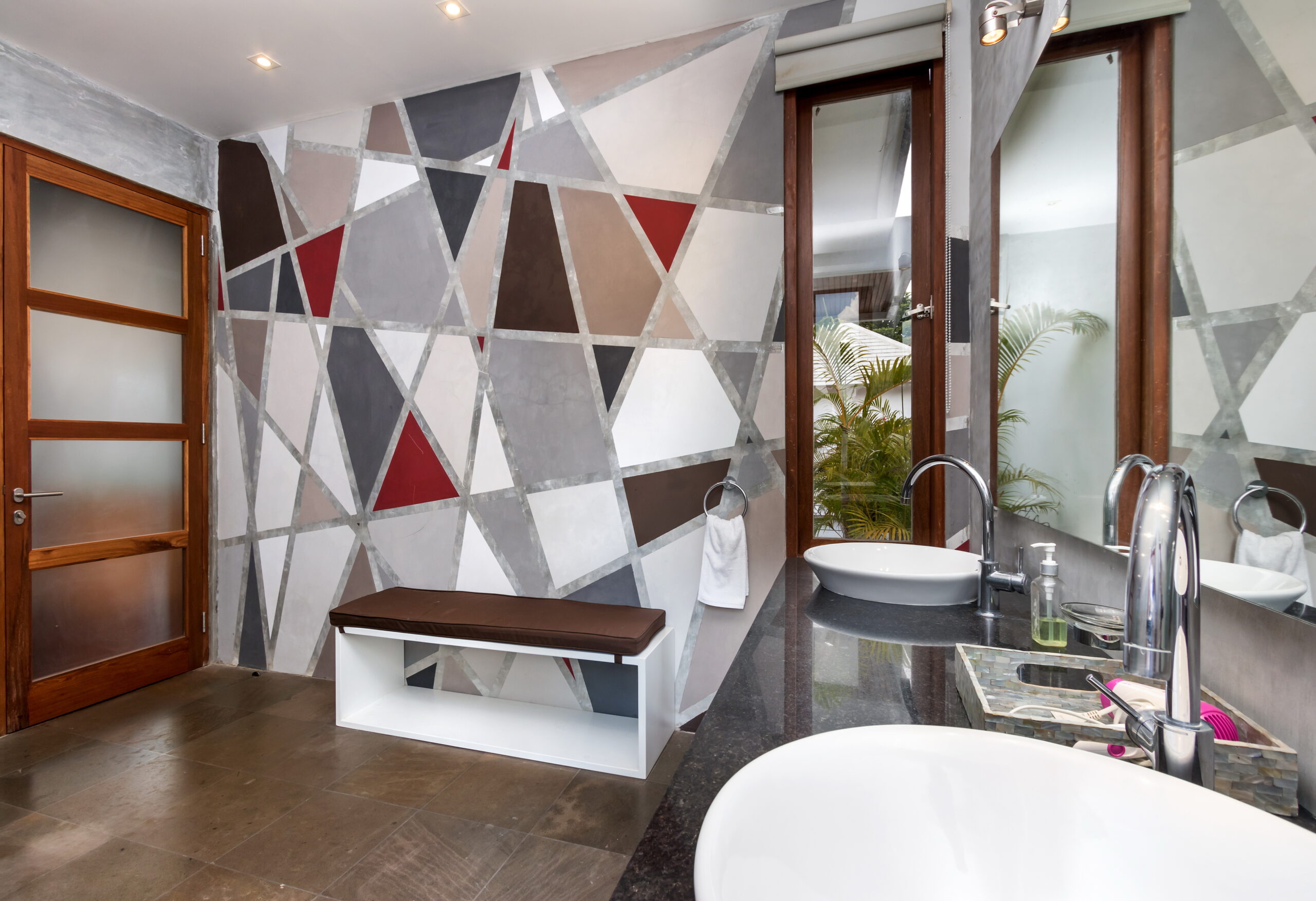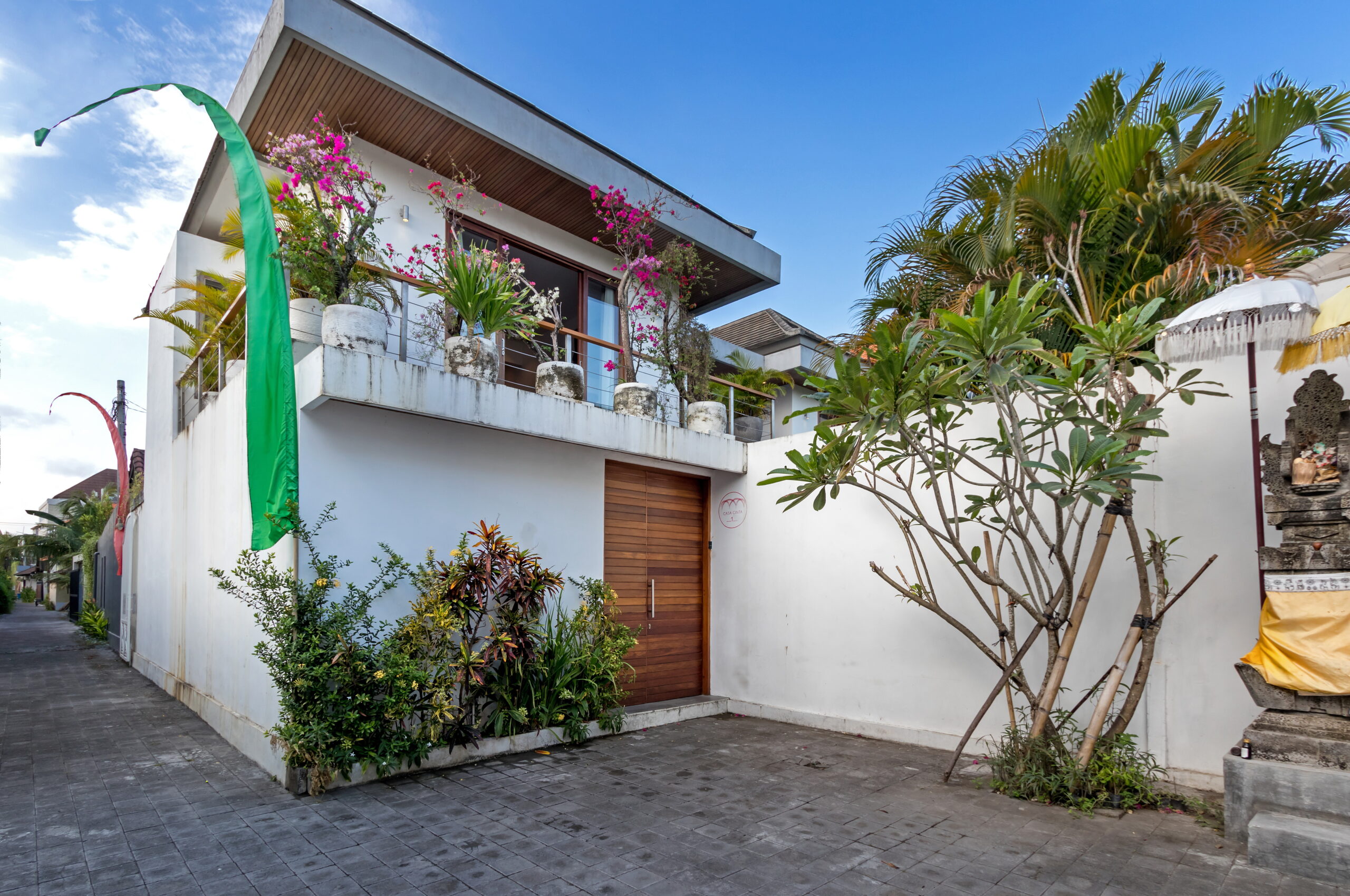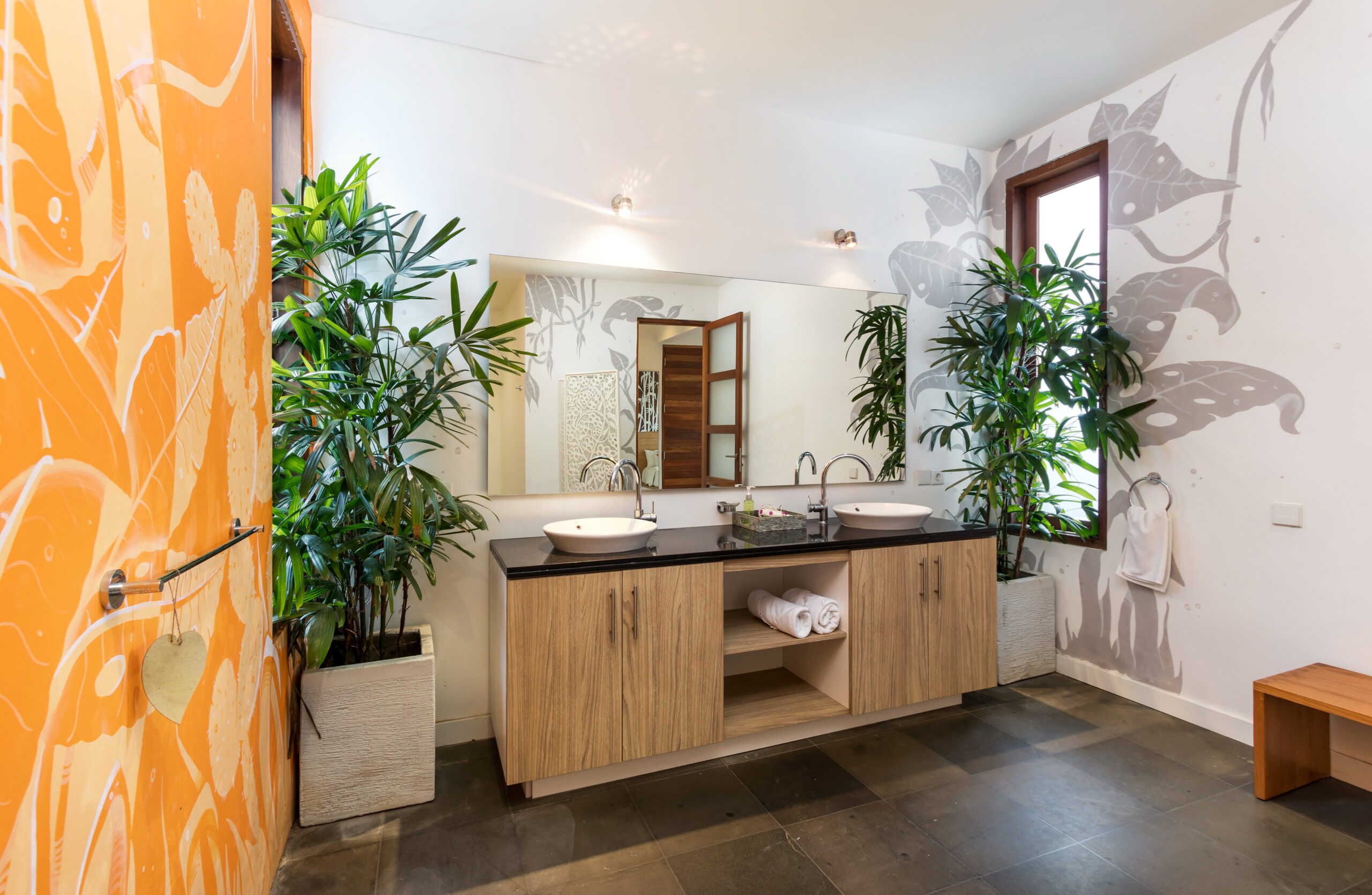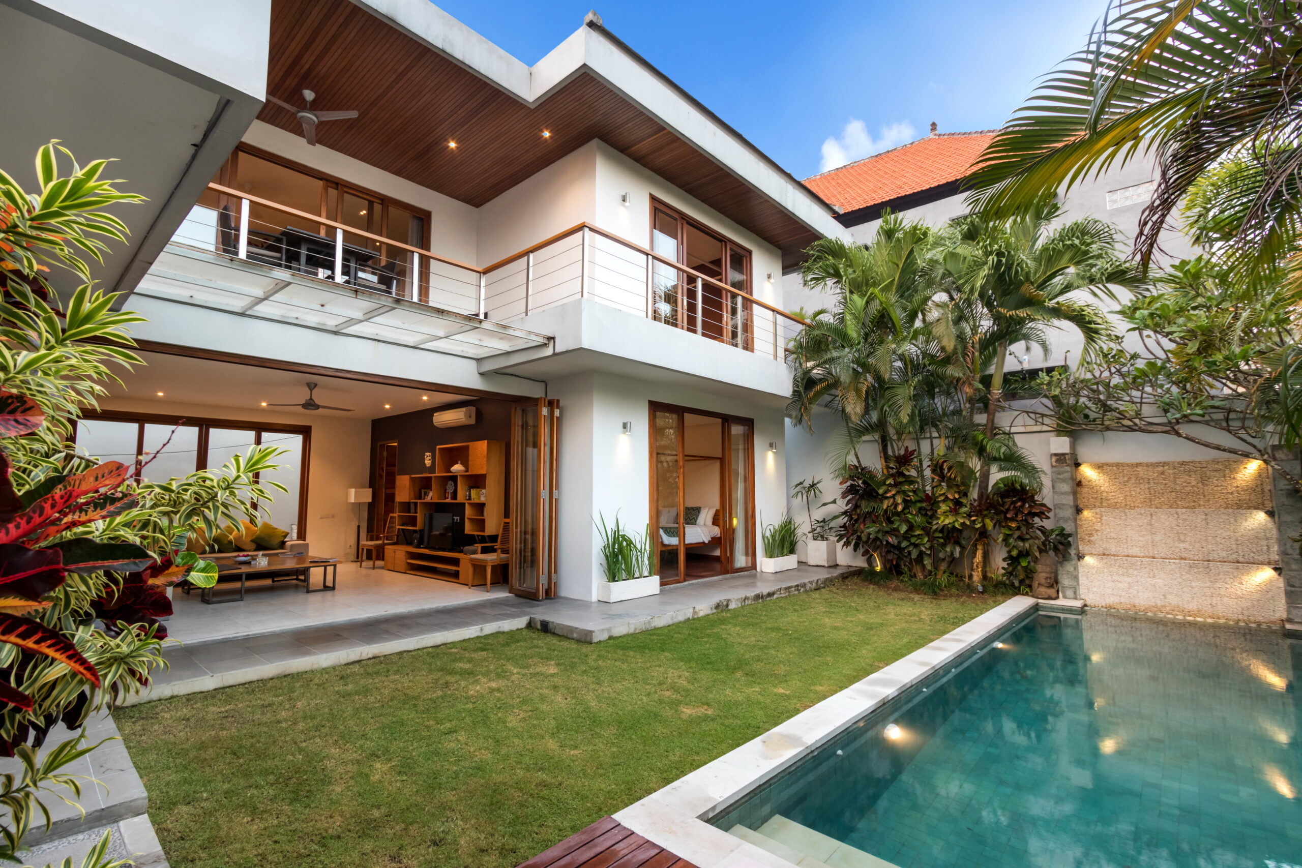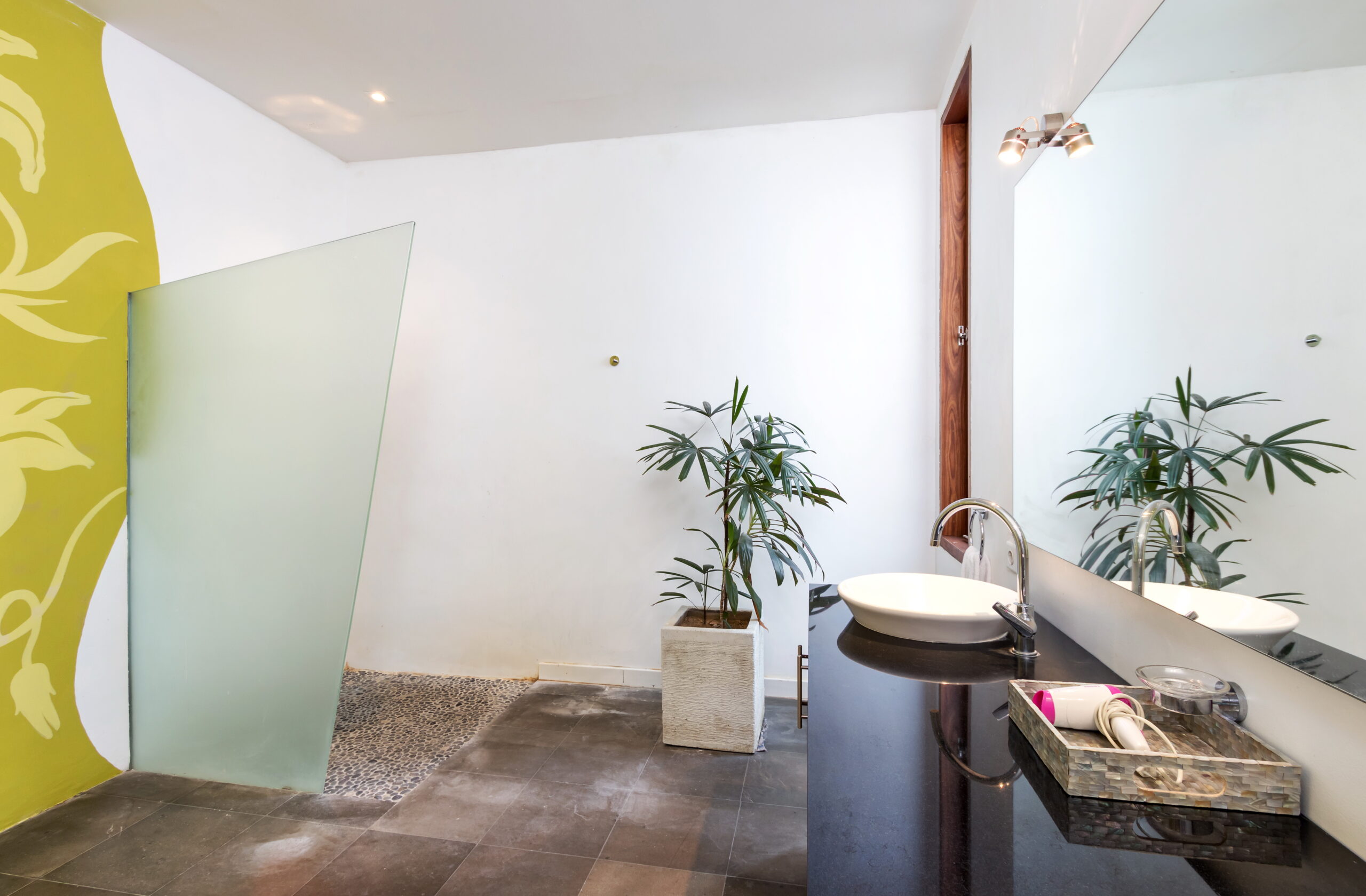 Casa Cinta 1 is a gorgeous 3-bedroom luxury villa, located just meters away from the beach in Batu Belig, a quiet area located strategically in between Seminyak and Canggu. The villa features a grand, modern, double-storey pavilion with a spacious, air-conditioned living room and three comfy villa suites. The most striking thing about Villa Casa Cinta 1 are the beautiful wall paintings made by Italian artists. They are handmade, unique and they give this villa character a unique character. Next door, you will find Villa Casa Cinta 2 – the 3-bedroom twin sister of Casa Cinta 1 and they can be rented out together for larger traveling groups. The interior design is of Villa Casa Cinta 1 is chic and contemporary. There is a lounge/entertainment corner, a dining area and a well-equipped state-of-the-art kitchen. From the comfy cushioned sofas, you can sit back to enjoy the garden view (in air-conditioned comfort that is!), or you can watch movies on the flat-screen cable TV with 60 international channels. A stack of DVDs and board games are provided for endless family fun. The timber dining table for 6 stands on an oriental carpet, next to a floor-to-ceiling mural painting of a tree. The chic, contemporary kitchen comes with a bar and 3 stools to sit and have coffee in the morning, beers in the afternoon and cocktails in the evening. The air-conditioned living room is easily configured into a tropical open-plan living space, giving almost direct access to the pool and the long chairs under the sun. Up on the first floor, there is another lounge area, furnished with a pull-out sofa-bed and a library of books. The walled garden is tropical as can be, featuring green foliage growing lushly by the side of the crystal clear, glistening swimming pool. The waterfall feature tops it off. The sound of rippling water certainly ads to the tranquil ambience of this luxury oasis of Batu Belig.