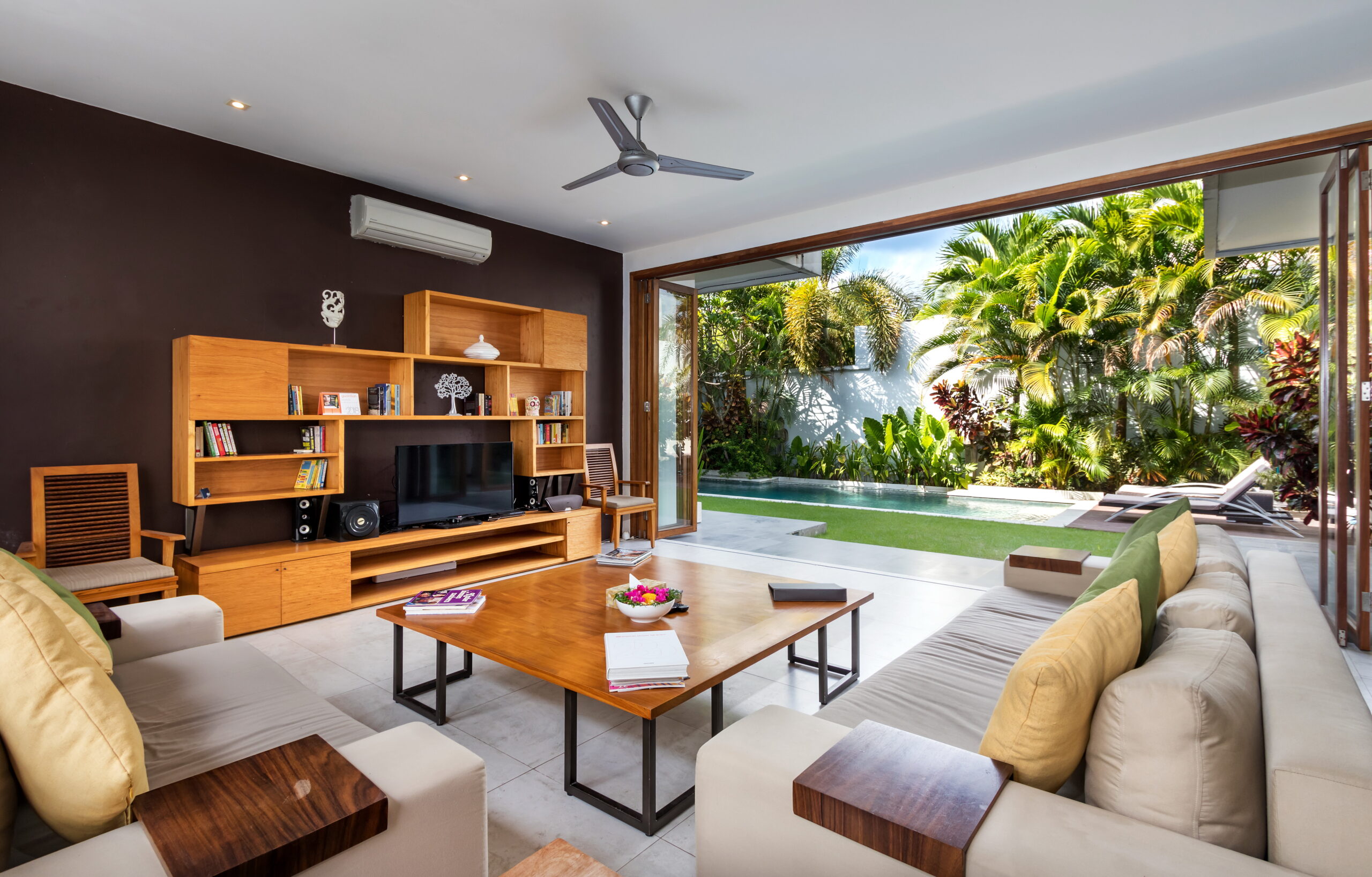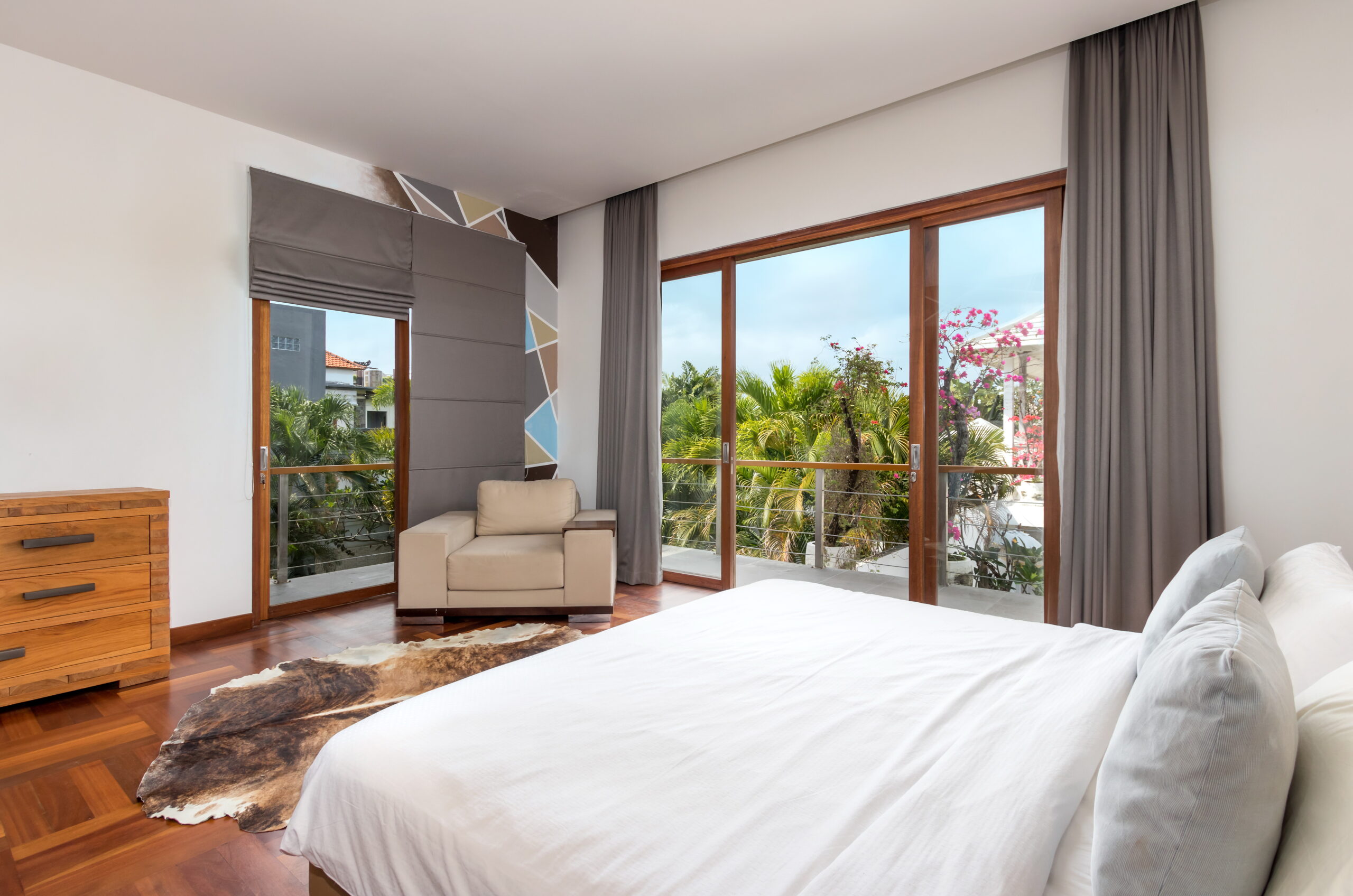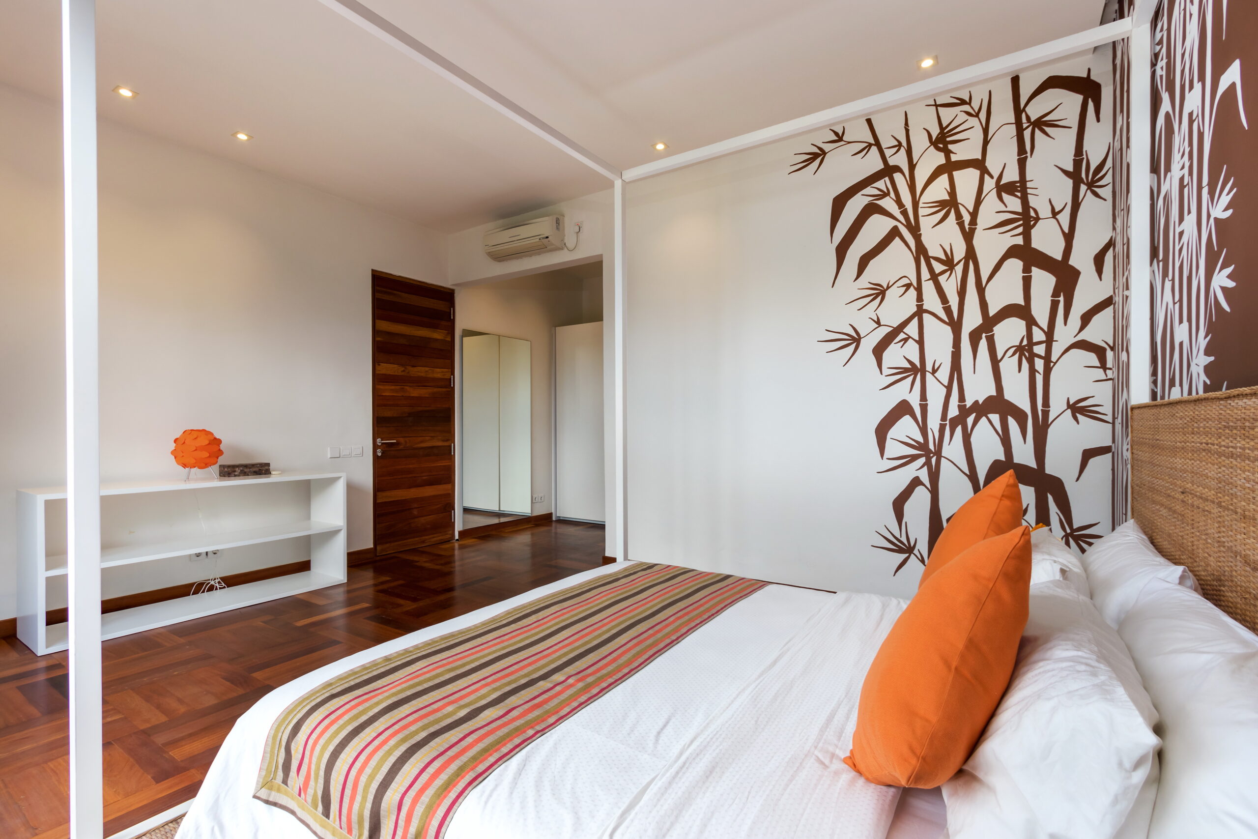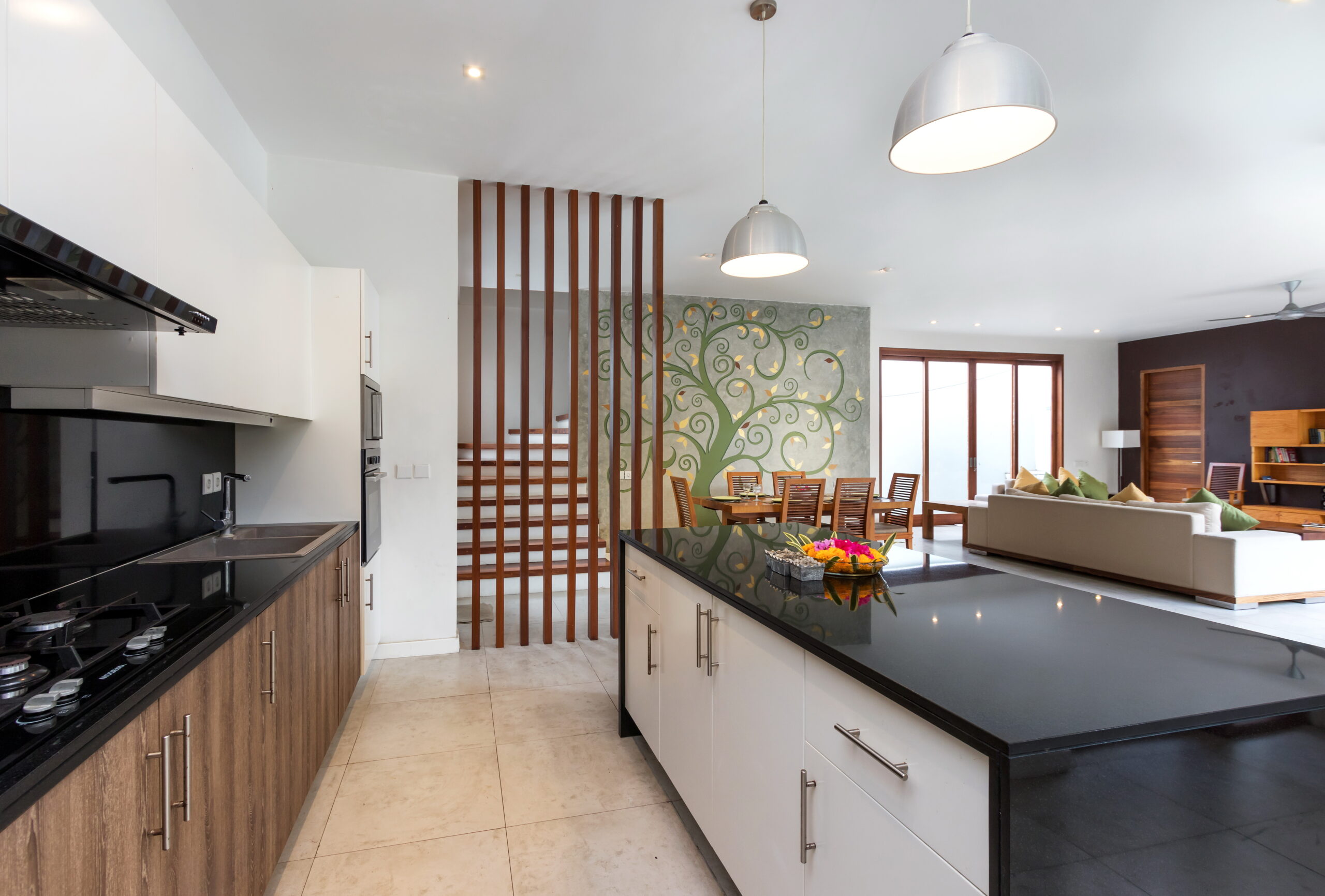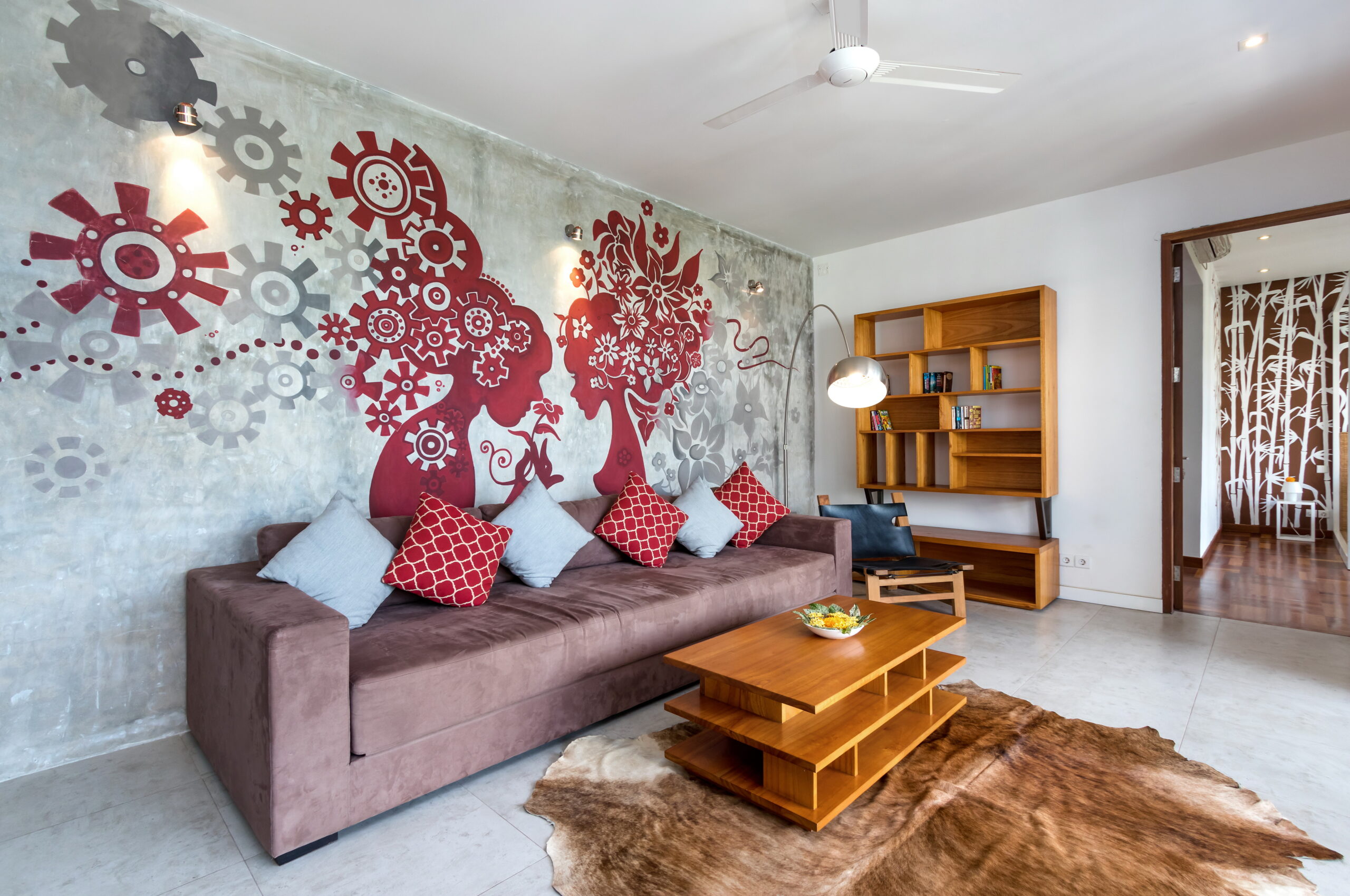 Casa Cinta 1 is a gorgeous 3-bedroom luxury villa, located just meters away from the beach in Batu Belig, a quiet area located strategically in between Seminyak and Canggu. The villa features a grand, modern, double-storey pavilion with a spacious, air-conditioned living room and three comfy villa suites. The most striking thing about Villa Casa Cinta 1 are the beautiful wall paintings made by Italian artists. They are handmade, unique and they give this villa character a unique character. Next door, you will find Villa Casa Cinta 2 – the 3-bedroom twin sister of Casa Cinta 1 and they can be rented out together for larger traveling groups. The interior design is of Villa Casa Cinta 1 is chic and contemporary. There is a lounge/entertainment corner, a dining area and a well-equipped state-of-the-art kitchen. From the comfy cushioned sofas, you can sit back to enjoy the garden view (in air-conditioned comfort that is!), or you can watch movies on the flat-screen cable TV with 60 international channels. A stack of DVDs and board games are provided for endless family fun. The timber dining table for 6 stands on an oriental carpet, next to a floor-to-ceiling mural painting of a tree. The chic, contemporary kitchen comes with a bar and 3 stools to sit and have coffee in the morning, beers in the afternoon and cocktails in the evening. The air-conditioned living room is easily configured into a tropical open-plan living space, giving almost direct access to the pool and the long chairs under the sun. Up on the first floor, there is another lounge area, furnished with a pull-out sofa-bed and a library of books. The walled garden is tropical as can be, featuring green foliage growing lushly by the side of the crystal clear, glistening swimming pool. The waterfall feature tops it off. The sound of rippling water certainly ads to the tranquil ambience of this luxury oasis of Batu Belig.