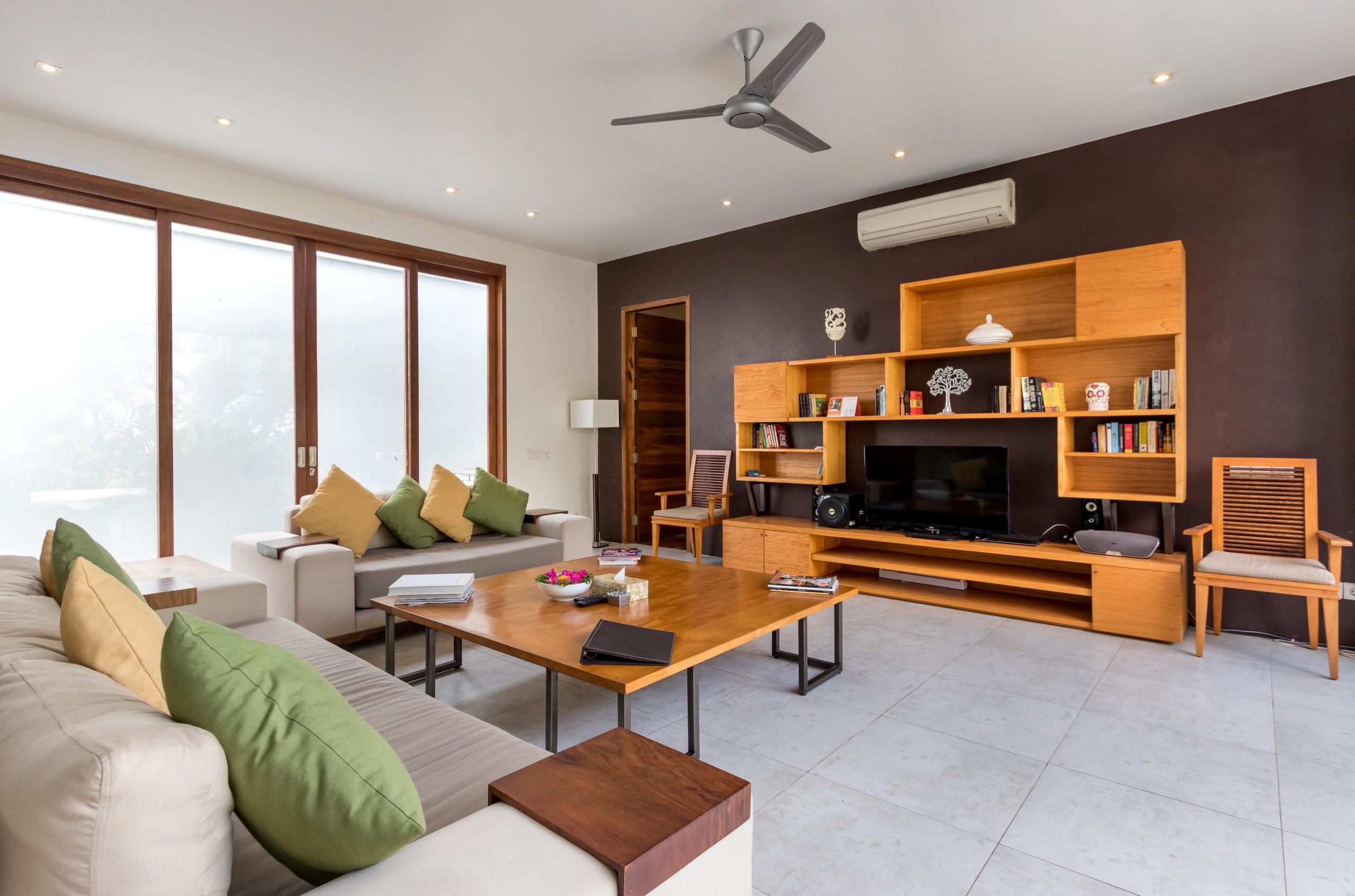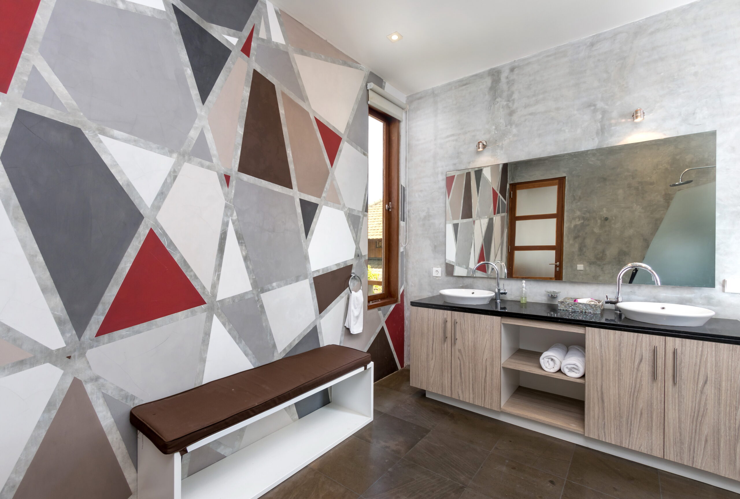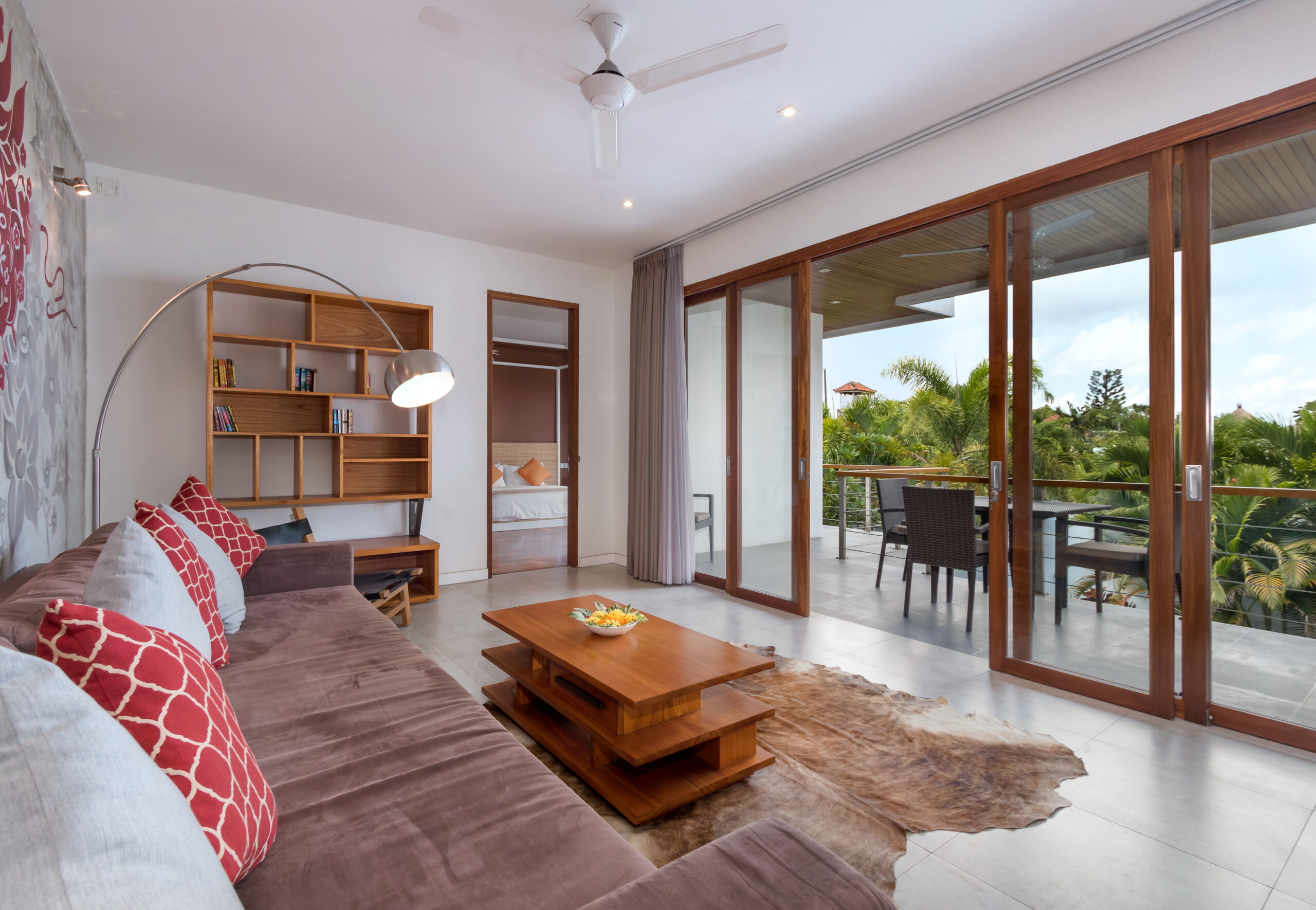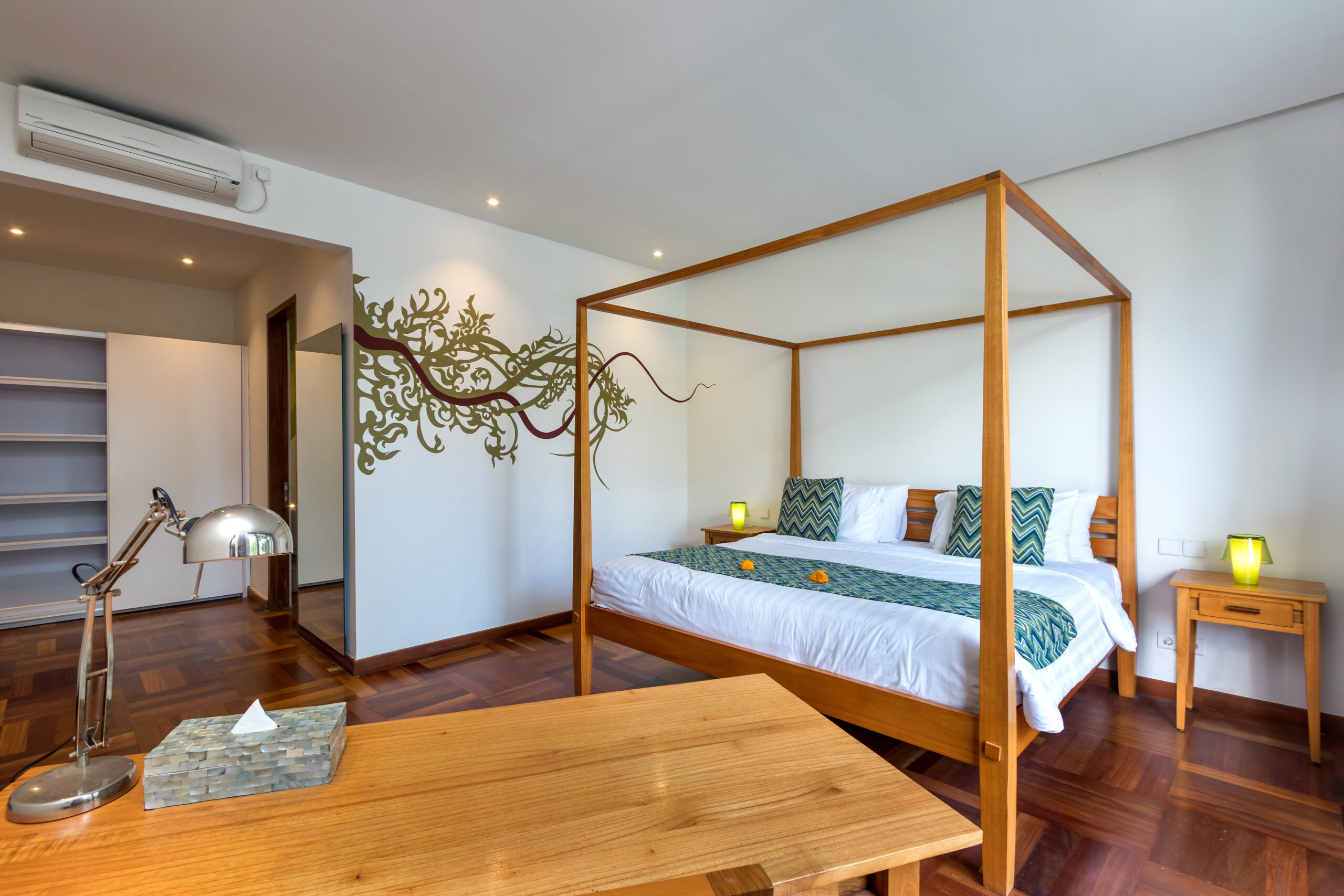 Villa Casa Cinta 1 houses 3 bedrooms. The first bedroom is found downstairs, opening up to the garden and pool. The second and third bedroom are located up on the first floor, adjoined to a breezy balcony that overlooks the garden and pool down below. All the villa’s bedrooms and bathrooms feature beautiful mural paintings in different shapes and colors, giving character to each individual-styled bedroom. All 3 bedrooms feature air-conditioning, rustic timber floors, four-poster king-size beds, wardrobes and en-suites fitted with rain showers. Bathroom guest amenities are provided. The master room comes with a plush carpet and a sofa – a perfect spot to curl up with a good book before sleep. An extensive library of books is available.