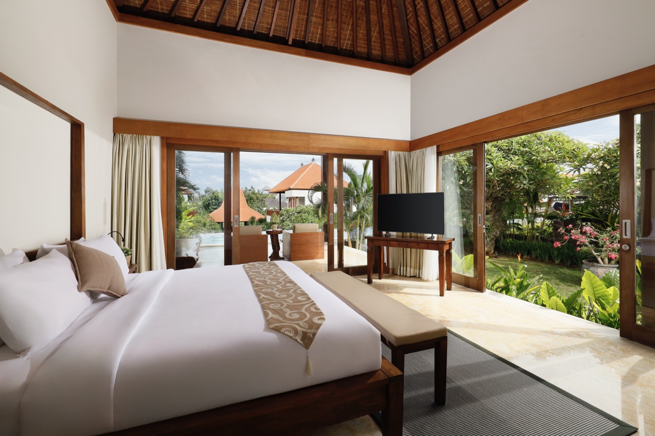 To the left, catch a glimpse of the living room and bedroom balcony. To the right, discover the swimming pool area with breathtaking views of Bali’s skyline, complete with daybeds for relaxation.