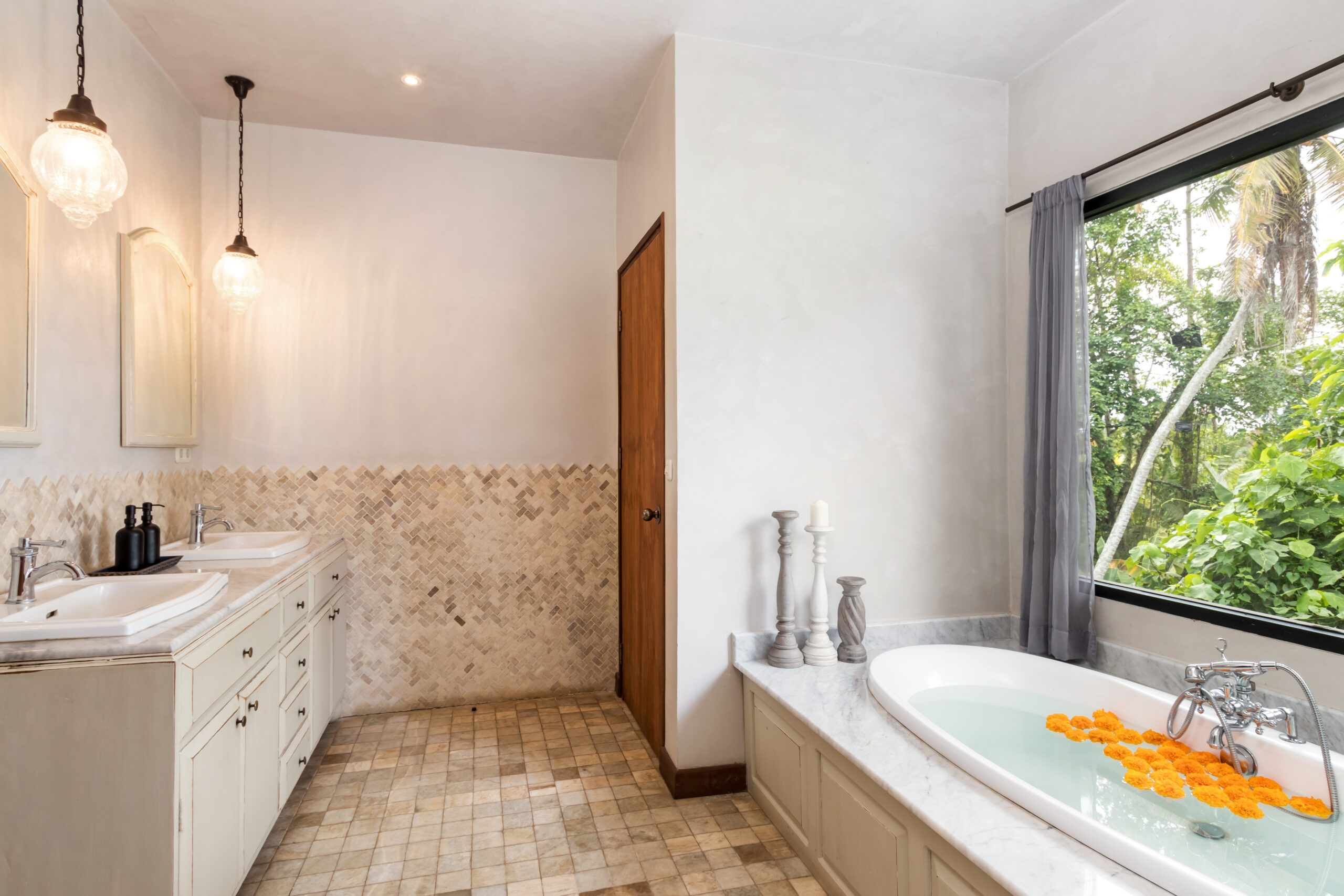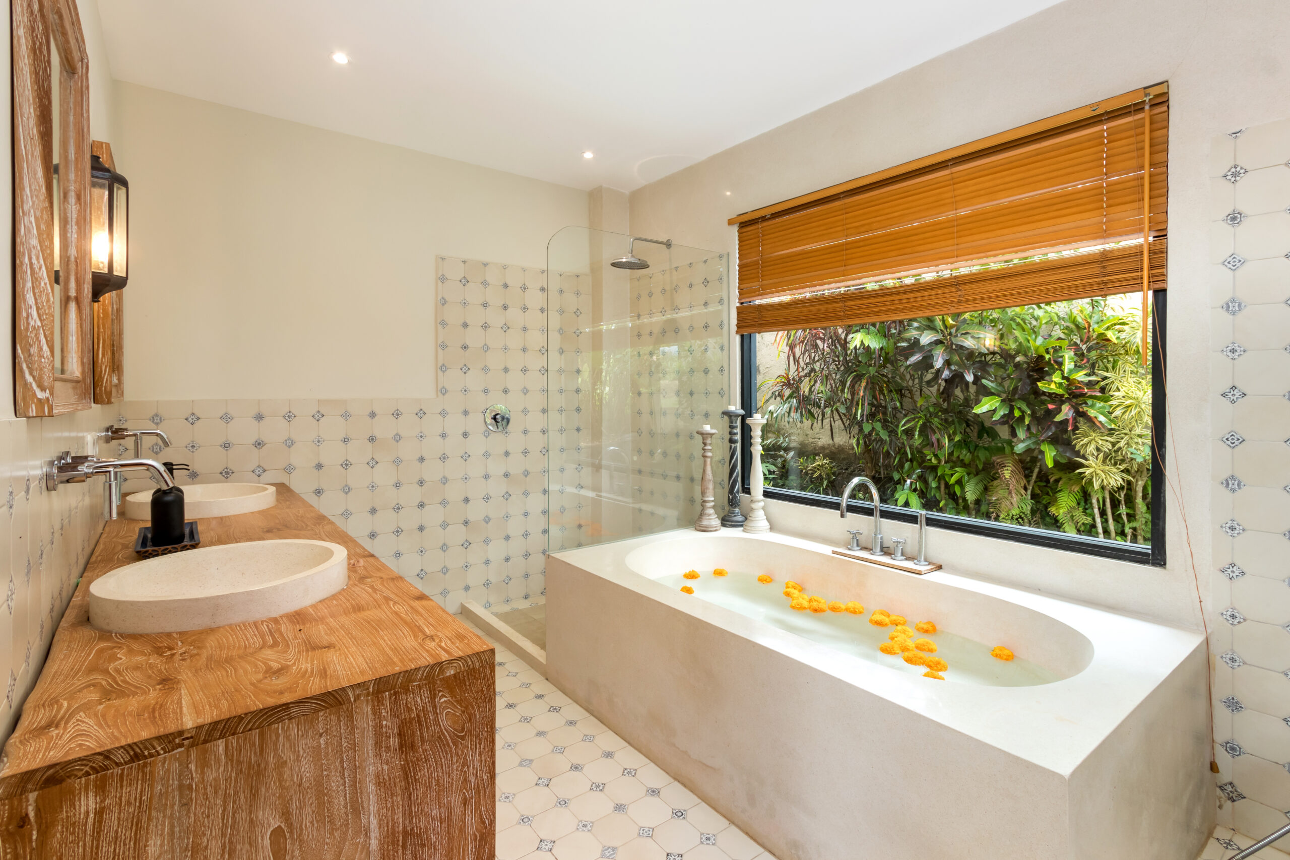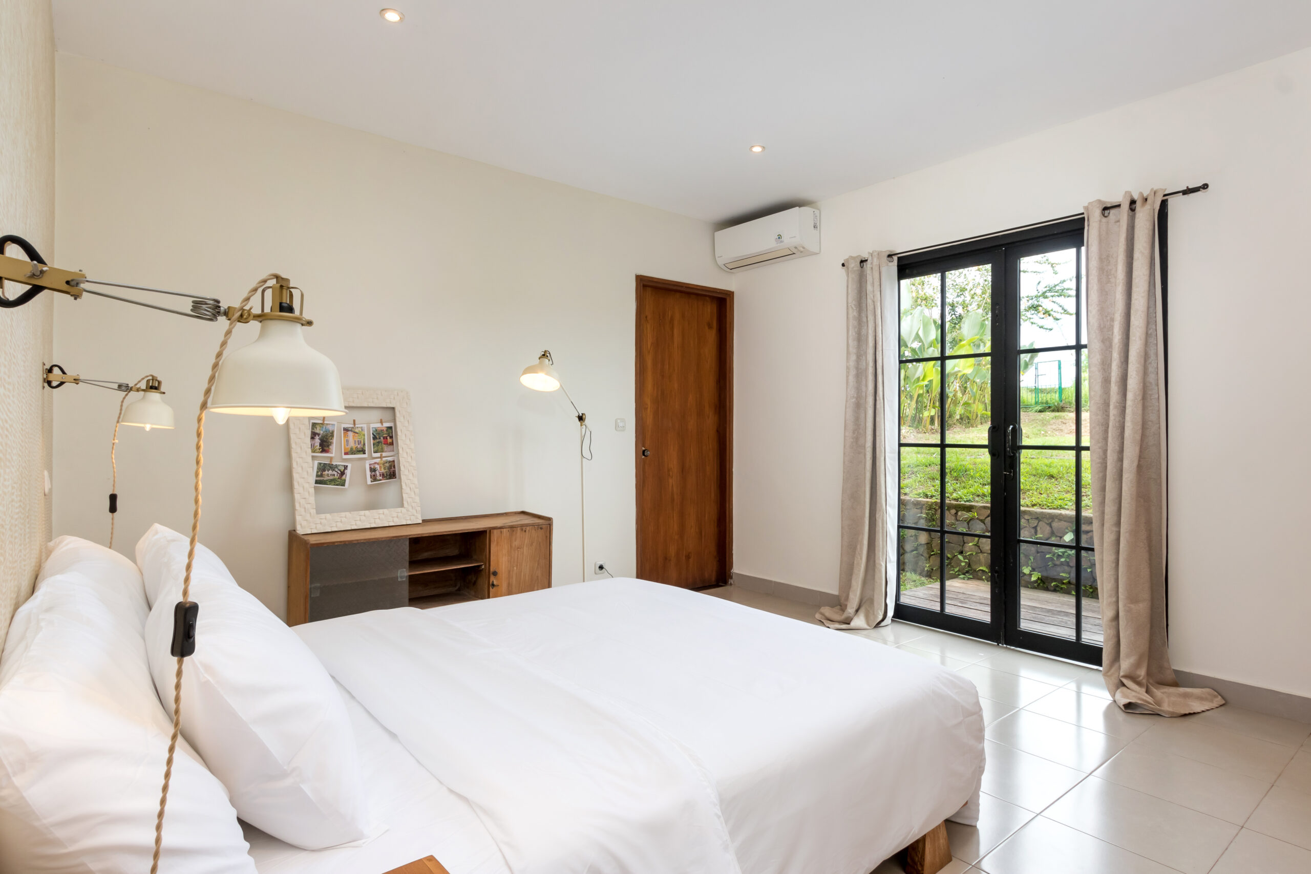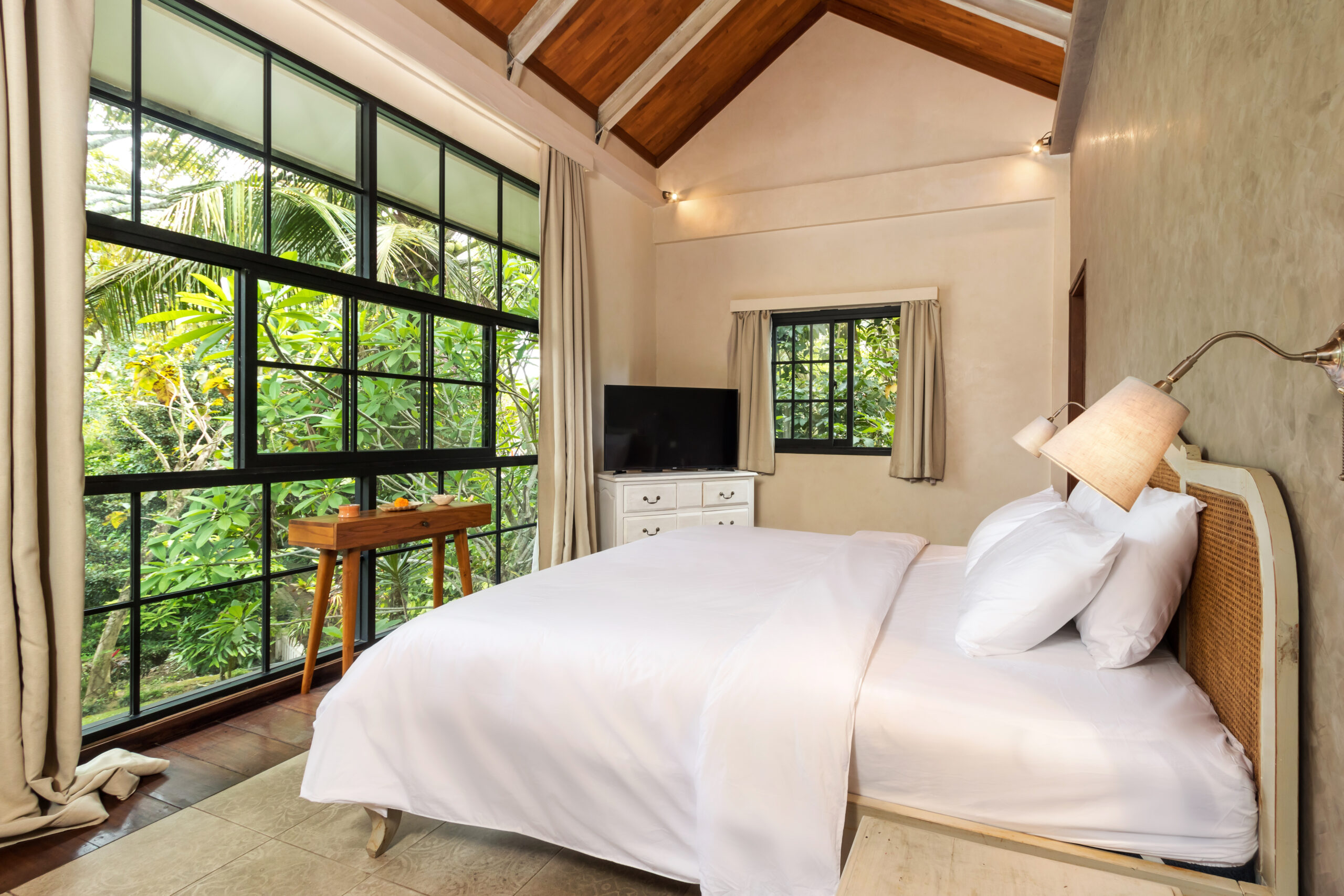 Villa Ananta is a 5-bedroom rental property for 10 guests. Four bedrooms have king beds and the fifth has twins. They are all air-conditioned. Three of these bedrooms come with ensuite bathrooms where you will find bathtubs. The master suite has a walk-in wardrobe with plenty of storage and hanging space. The bedrooms are spacious and airy. They have bedside tables, wardrobes, and armchairs. Large glass windows offer views of the surrounding greenery. High-quality mattresses, soft linen, and extra pillows will give you a restful night. The master suite also has a television.