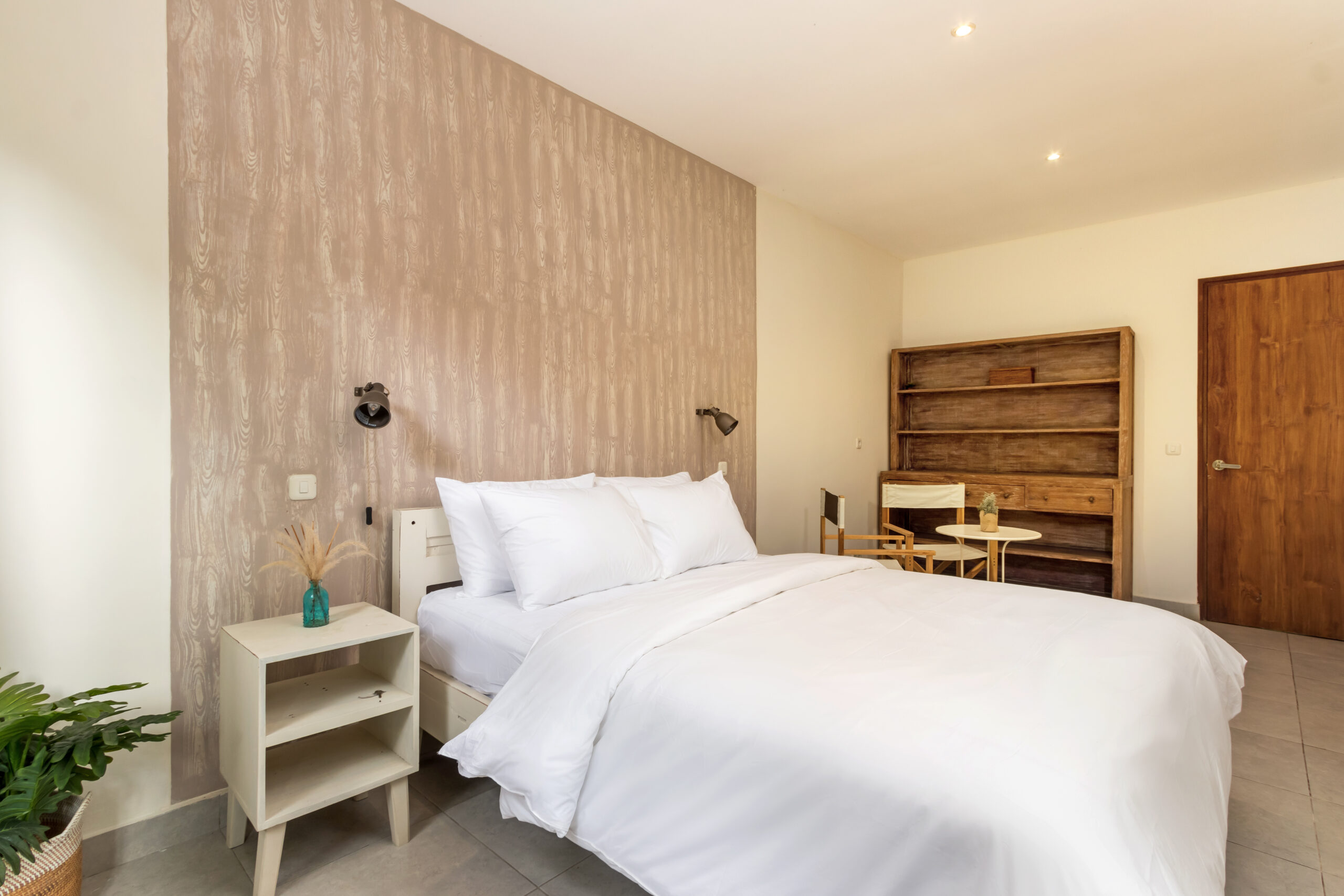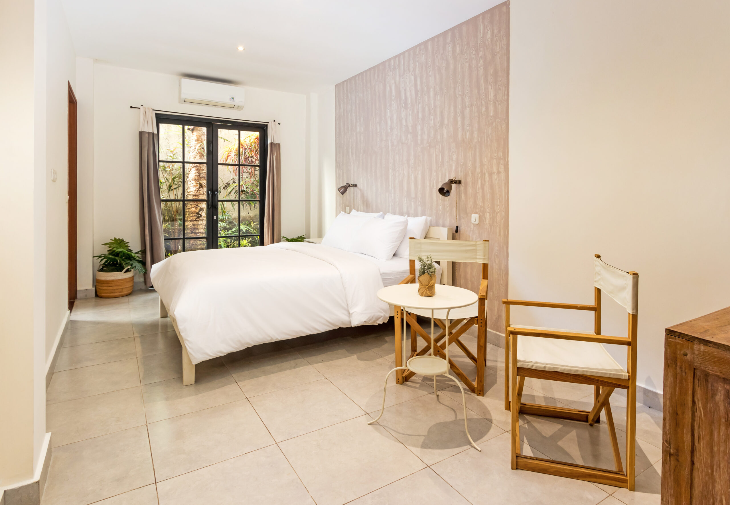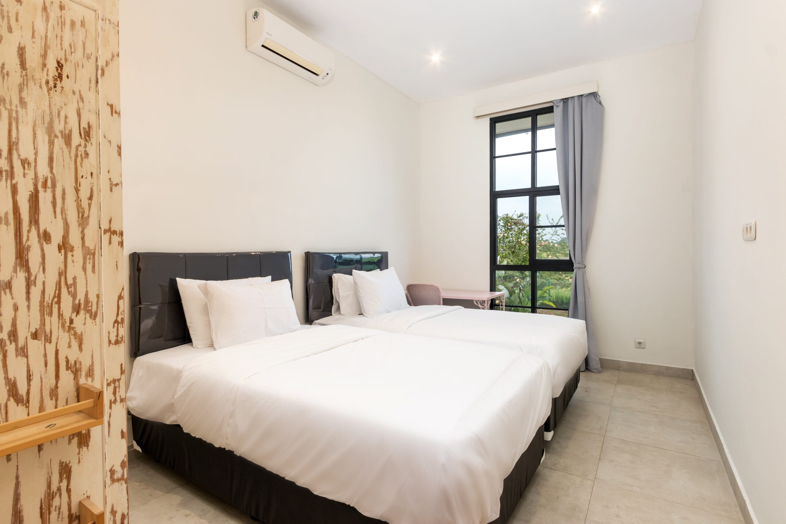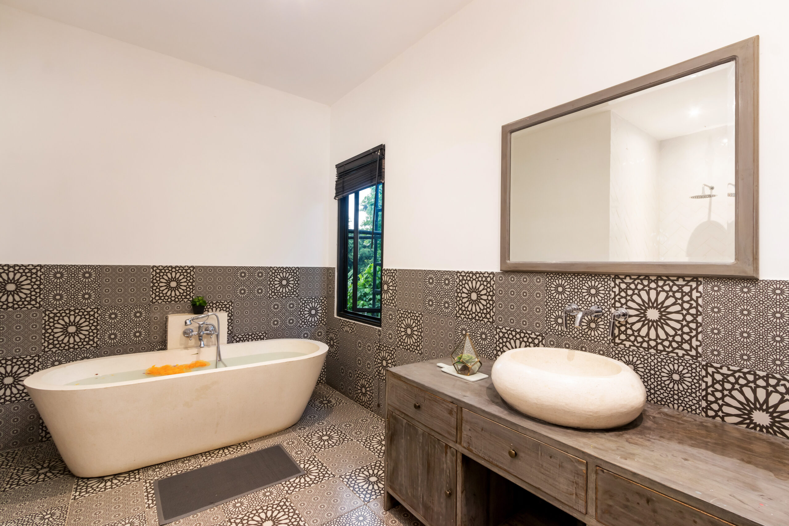 Villa Ananta is a 5-bedroom rental property for 10 guests. Four bedrooms have king beds and the fifth has twins. They are all air-conditioned. Three of these bedrooms come with ensuite bathrooms where you will find bathtubs. The master suite has a walk-in wardrobe with plenty of storage and hanging space. The bedrooms are spacious and airy. They have bedside tables, wardrobes, and armchairs. Large glass windows offer views of the surrounding greenery. High-quality mattresses, soft linen, and extra pillows will give you a restful night. The master suite also has a television.