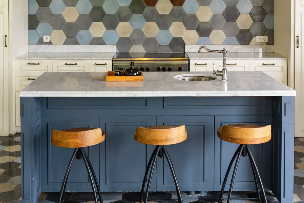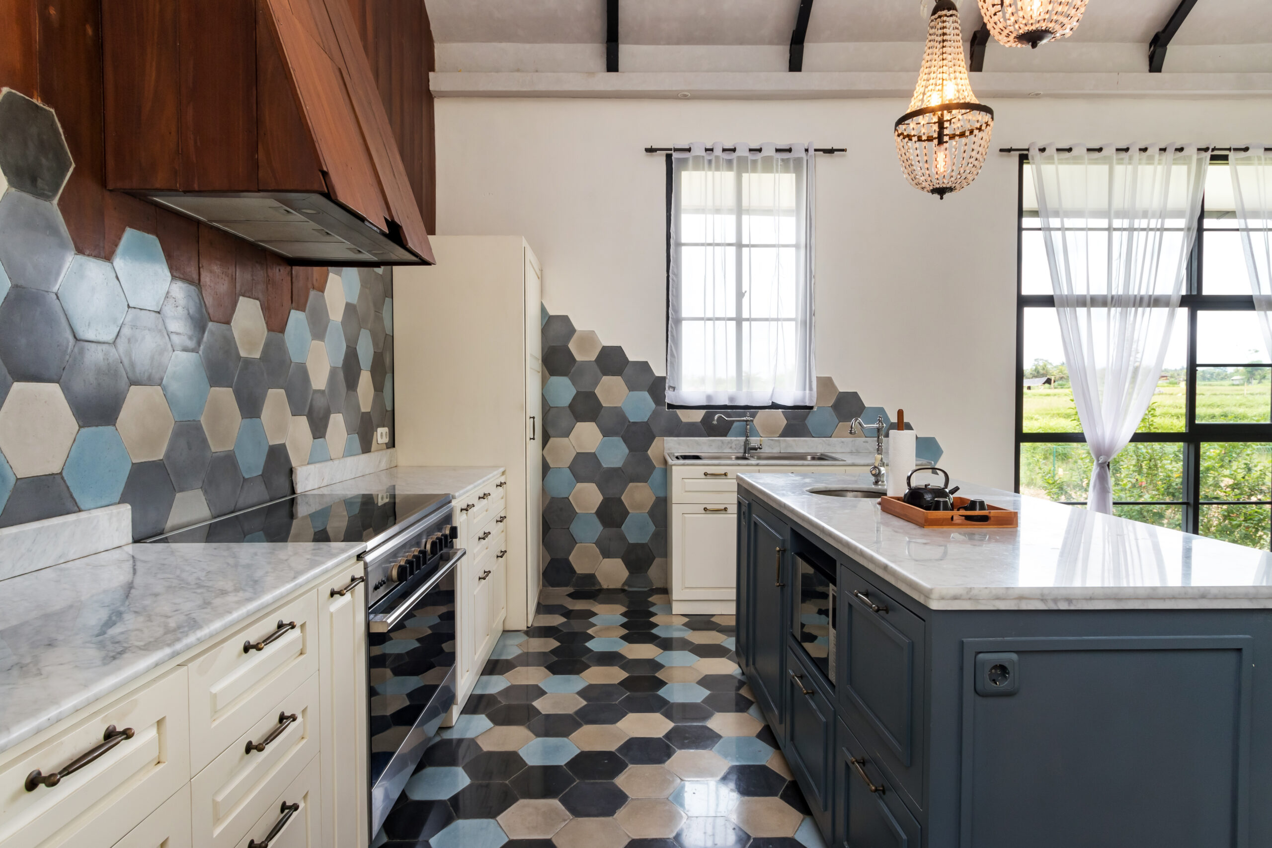 Several loungers are placed all around for your relaxation. You can read a book, sip a drink, and soak up the warm sun here. There is also a poolside shaded gazebo with a sofa and coffee table. You can relax here if you prefer shade. On the upper floor, there is an open-plan living/dining space and also a modern kitchen. The lounging area has a wide-screen television and a sofa. It faces a wide balcony. You will find the dining table at the backside of this room, followed by the kitchen.