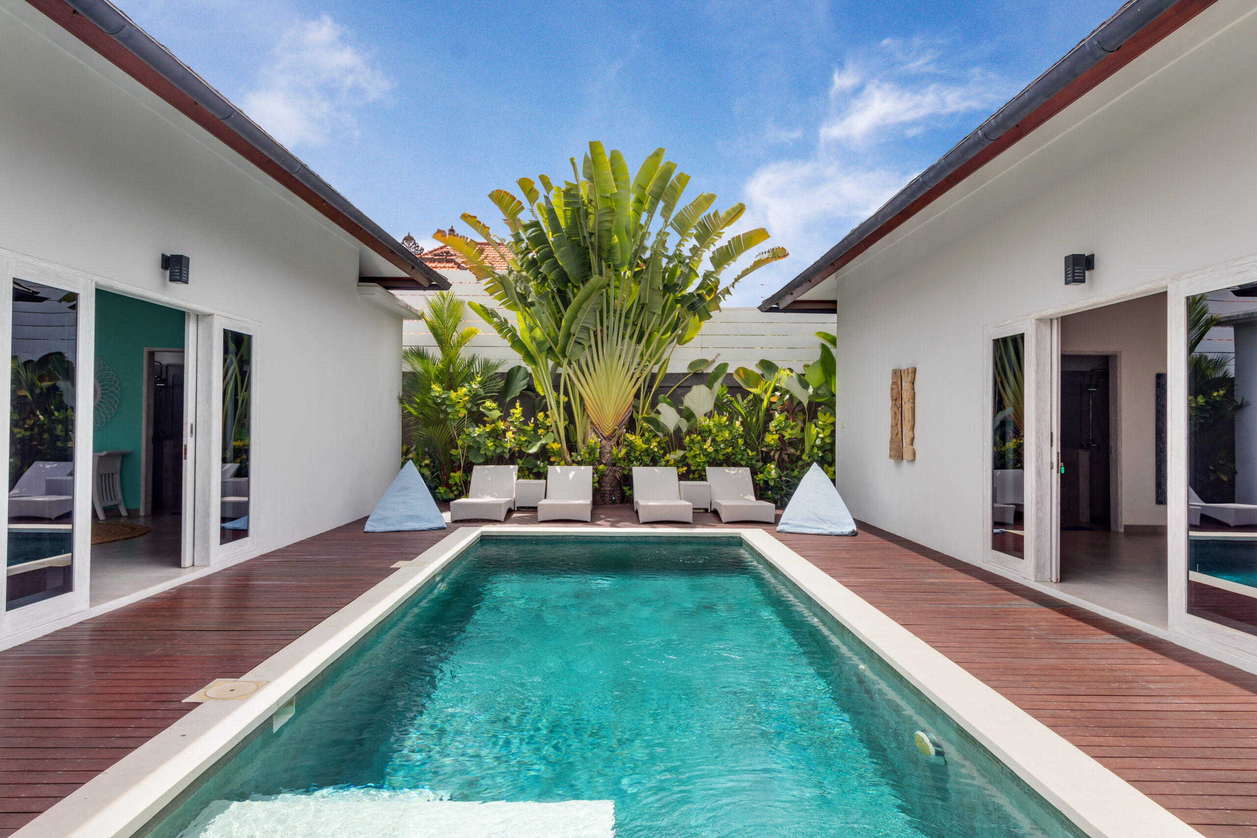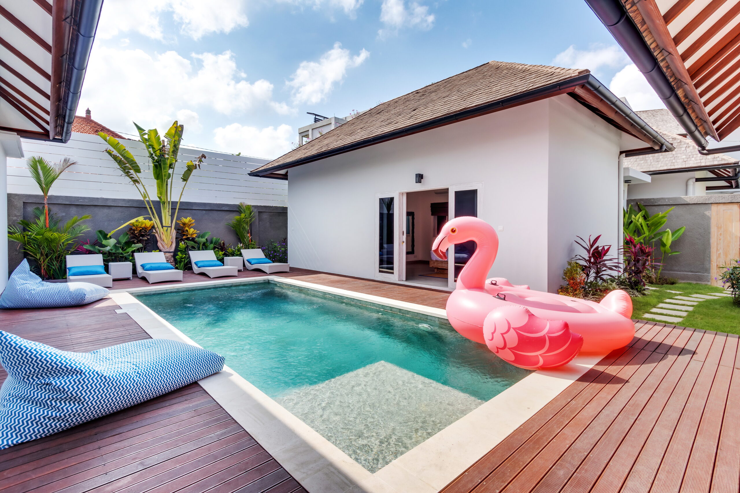 Villa Hiburan 2 makes a perfect holiday haven for families. A sunny garden, a private pool with a shallow platform, an airy and comfy open-plan living space and 3 bedrooms. Seminyak and Canggu are easily reached within minutes and you can even walk to the beach to catch the sunset. Wonderful! Family holidays just can’t go wrong with such a peaceful yet strategic location in Batu Belig, Bali.
