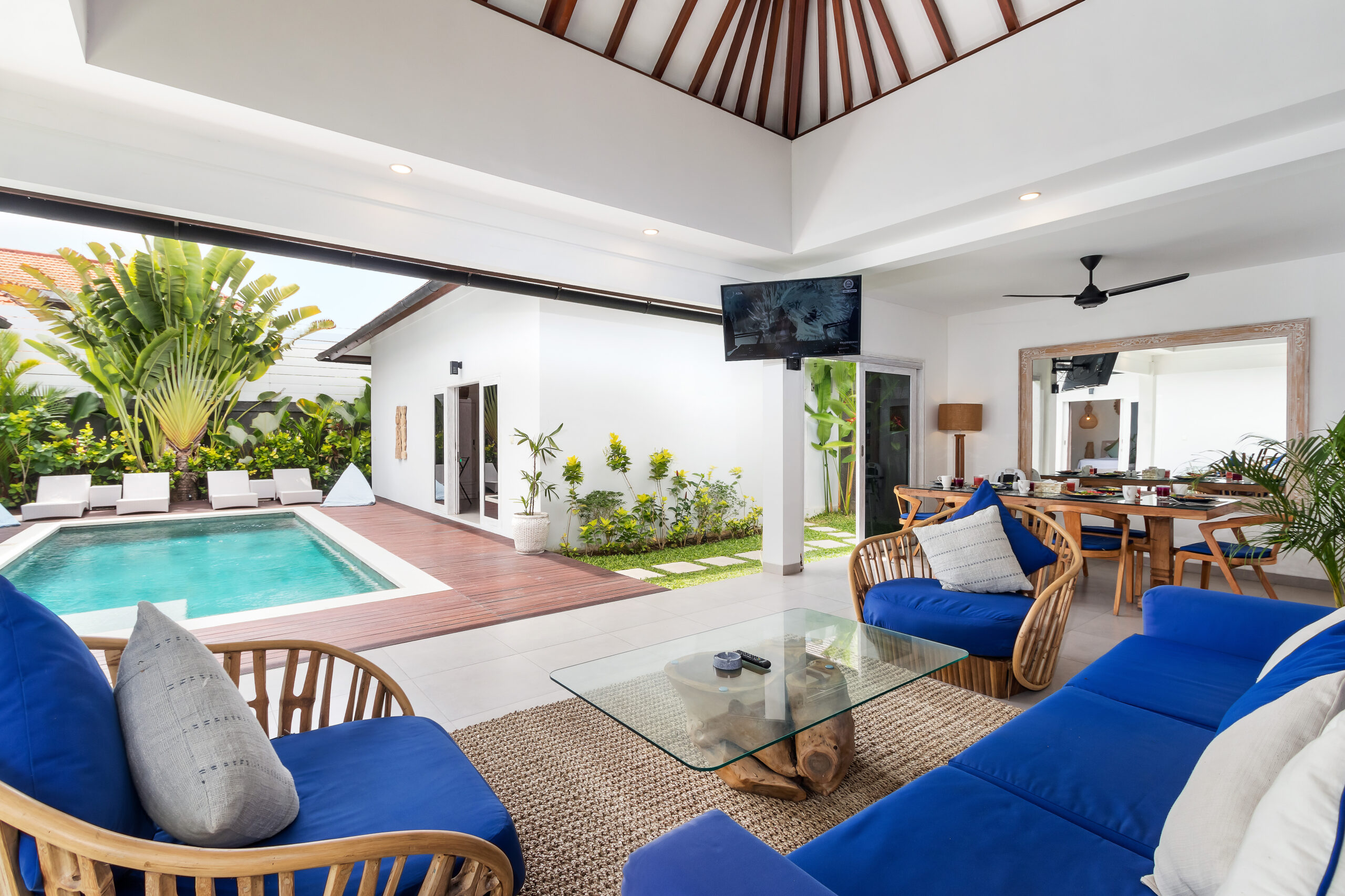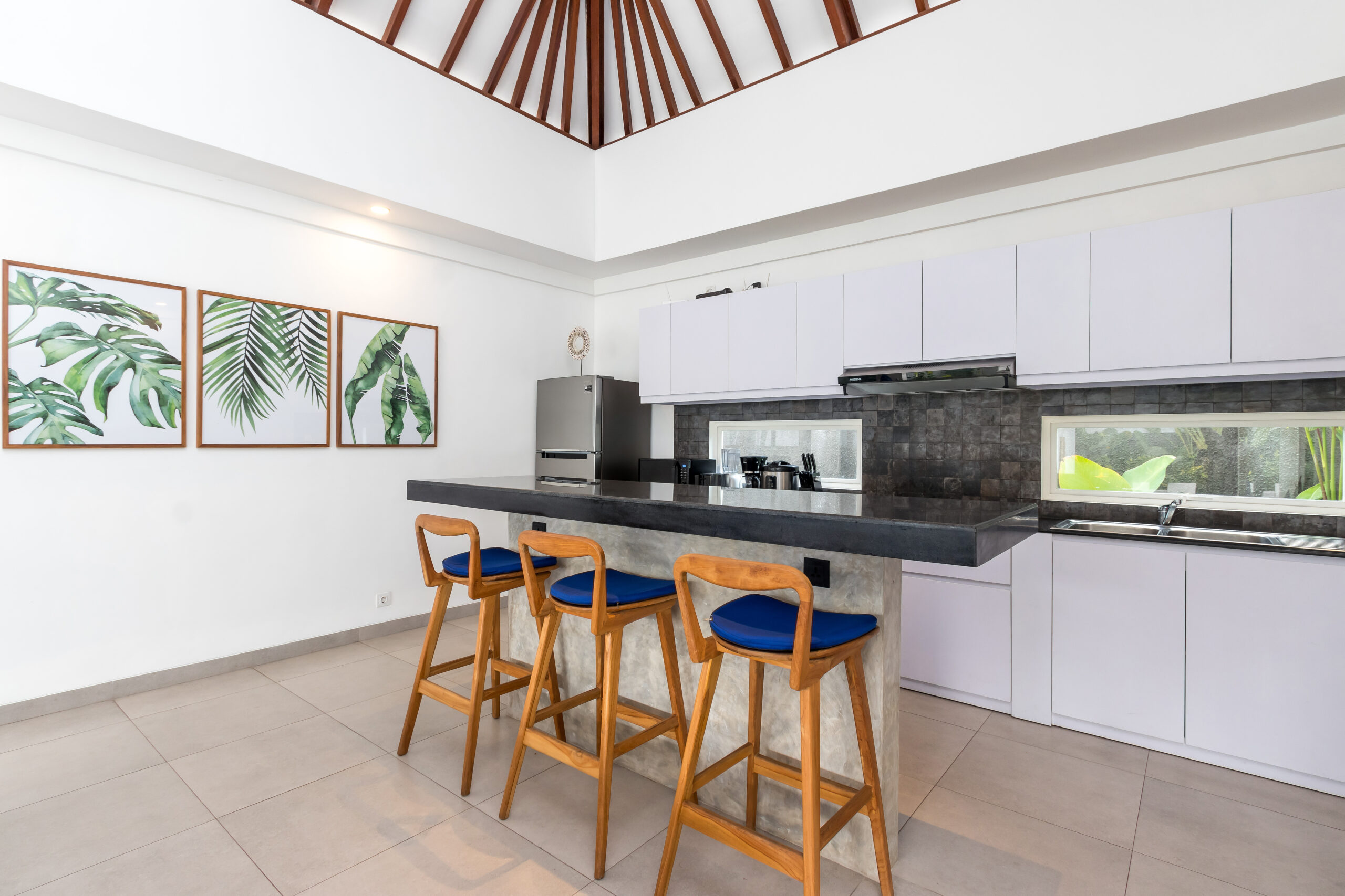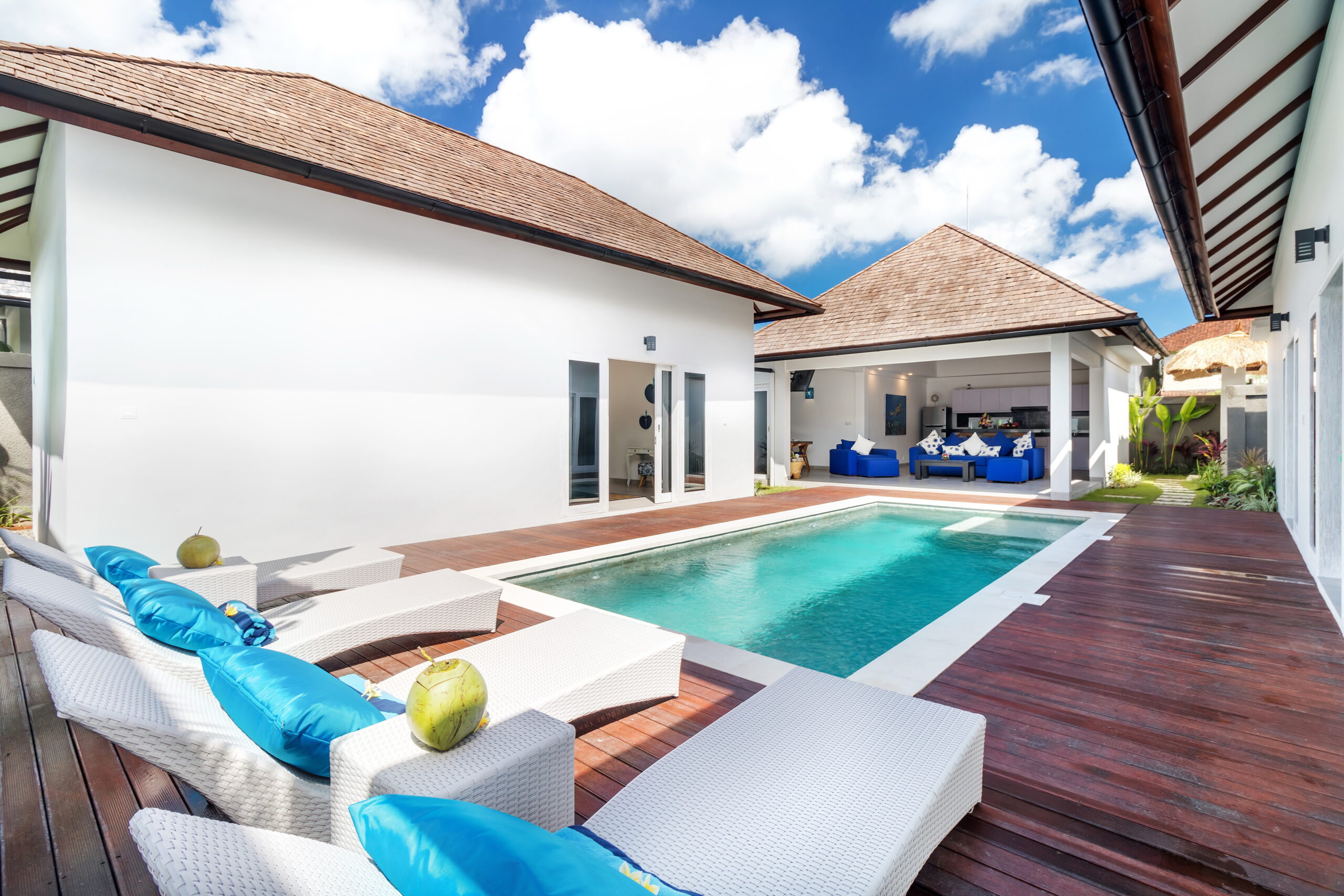 The 3 bedrooms are situated around the swimming pool, featuring glass doors that slide open to the outdoor area where you can jump straight into the pool. Each room is air-conditioned and individually styled in elegant tropical ways. What they have in common are the colour blue infused in the decoratives and other details. Every room has got a large and comfy queen-size bed to sleep on, there are whitewashed timber wardrobe closets to put your clothes and for your most valuable items, all the rooms have a safety box. The en-suite bathrooms are spacious, and equipped with overhead rainfall showers, hand showers, washbasins, and toilets.