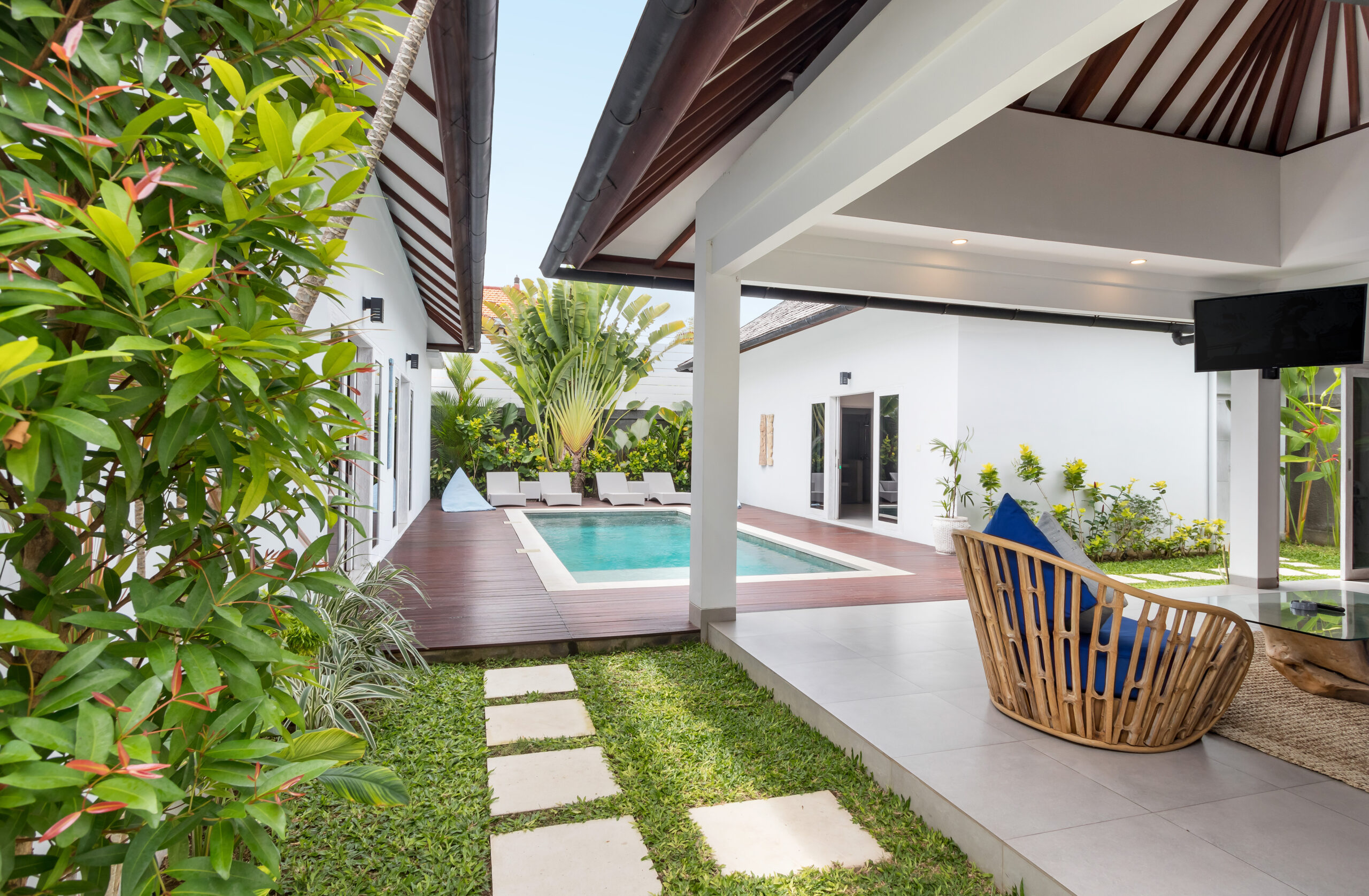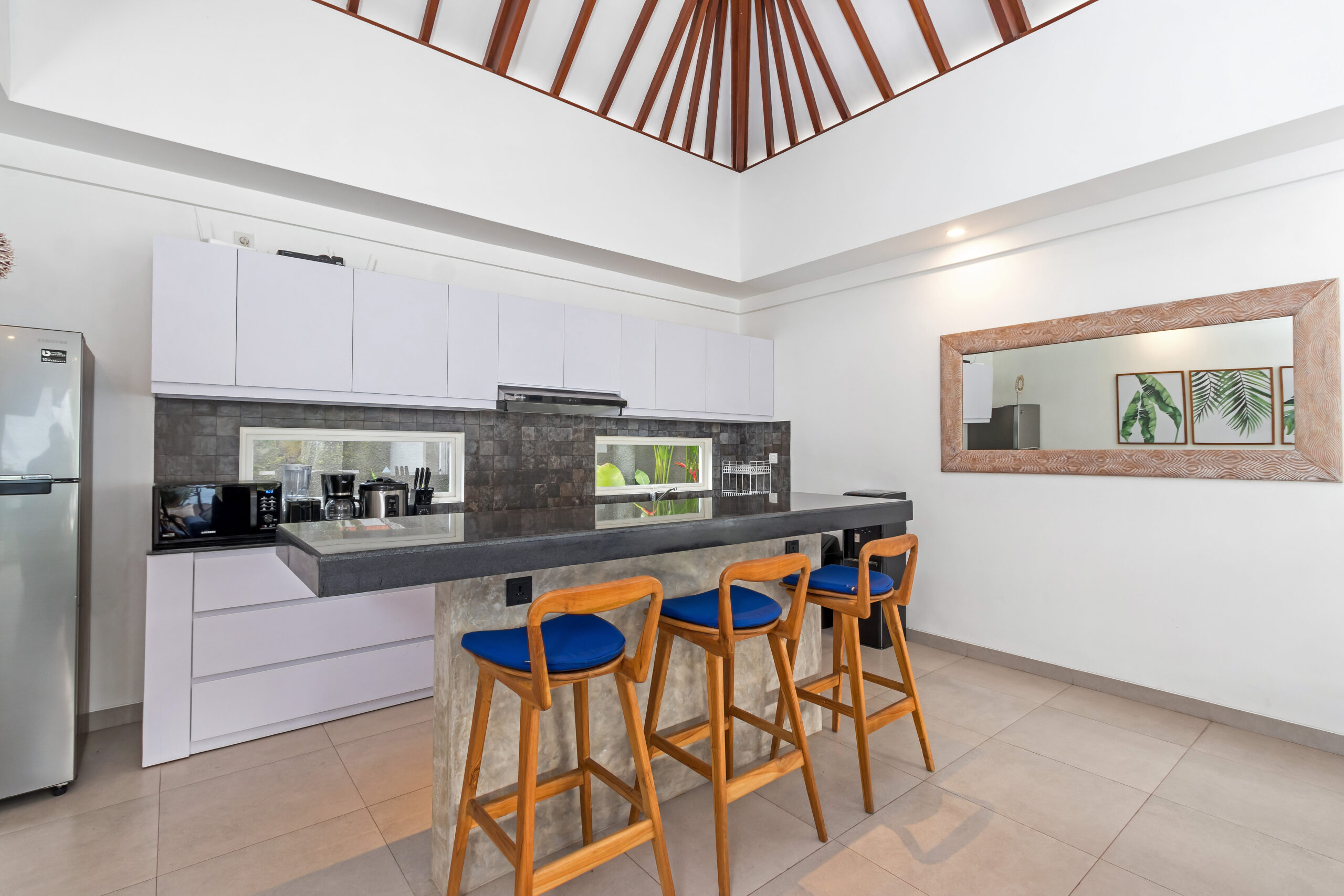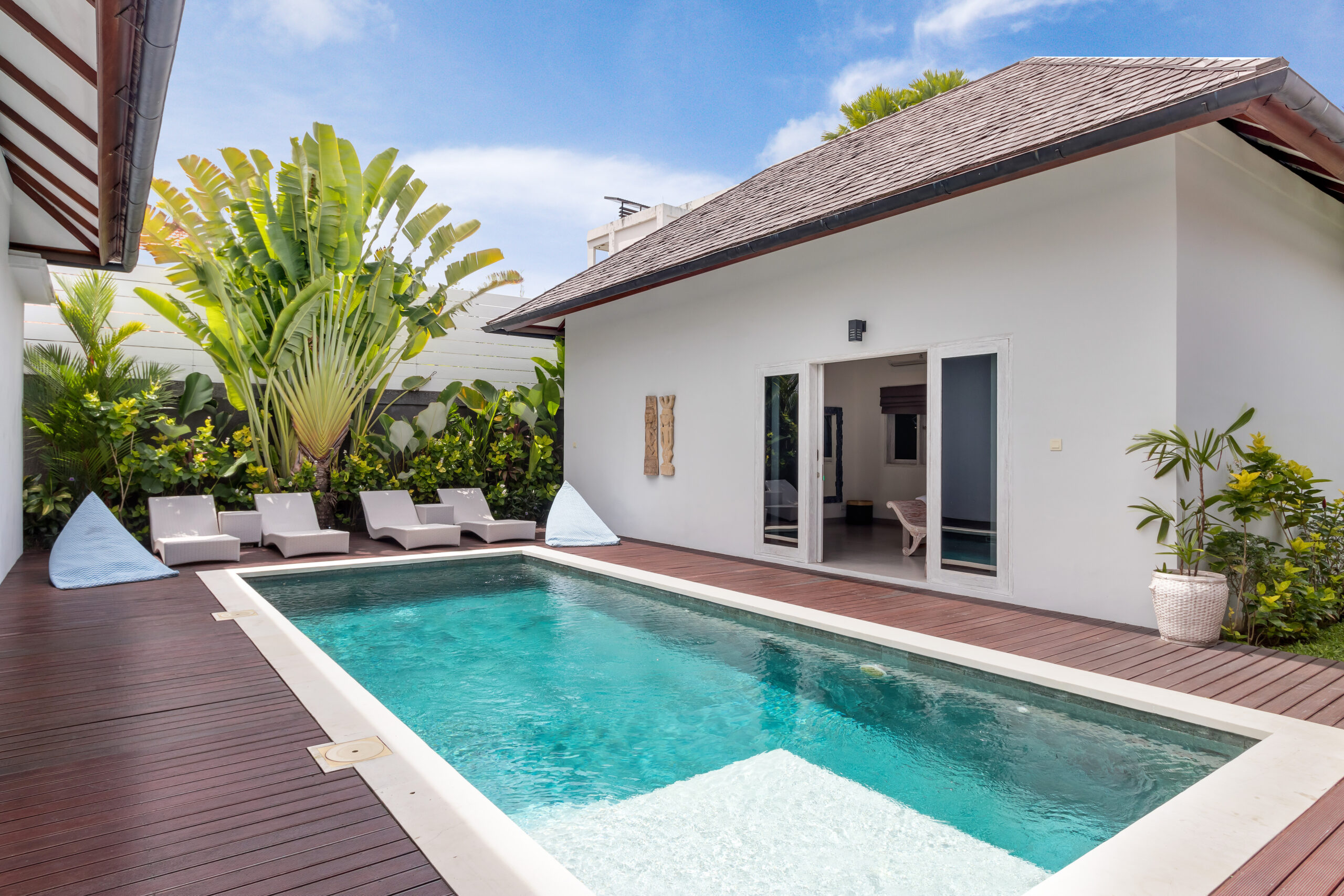 The 3 bedrooms are situated around the swimming pool, featuring glass doors that slide open to the outdoor area where you can jump straight into the pool. Each room is air-conditioned and individually styled in elegant tropical ways. What they have in common are the colour blue infused in the decoratives and other details. Every room has got a large and comfy queen-size bed to sleep on, there are whitewashed timber wardrobe closets to put your clothes and for your most valuable items, all the rooms have a safety box. The en-suite bathrooms are spacious, and equipped with overhead rainfall showers, hand showers, washbasins, and toilets.