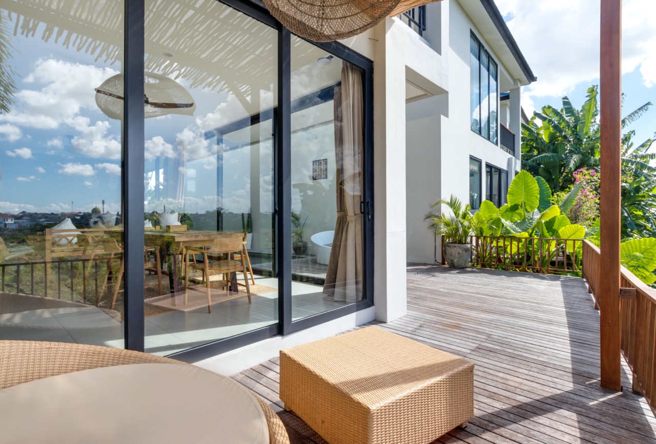 The common areas of this private home feature a 200-square-meter garden that seems to merge with the countryside that surrounds the property. This ensures the guests staying here will be surrounded by greenery. The wooden deck is a key feature. It is an L-shaped deck with a private swimming pool in its shaded corner. Swim in the shade, away from Bali’s hot sun. A couple of loungers are also placed here. On its sunny section, the deck faces a rice field. This part also has a shaded corner with a lounger. From the deck, two glass sliding doors will take you to the villa’s living room. Tastefully decorated, the room has comfortable sofas and armchairs facing a television in one corner. In the other corner, you will find a wooden dining table for eight. The kitchen is beside the dining area, so you can bring the food easily.