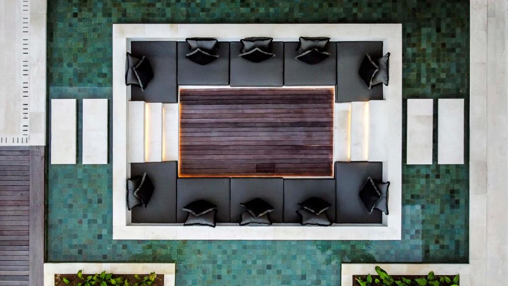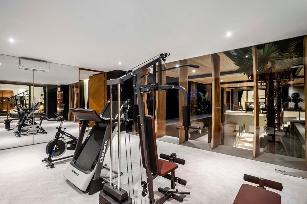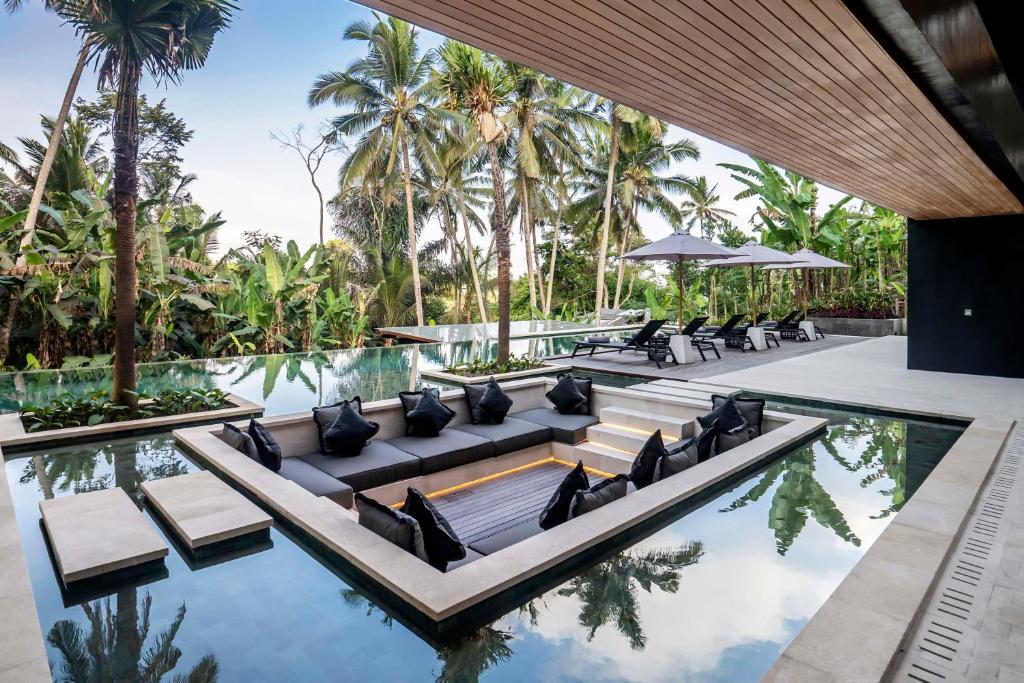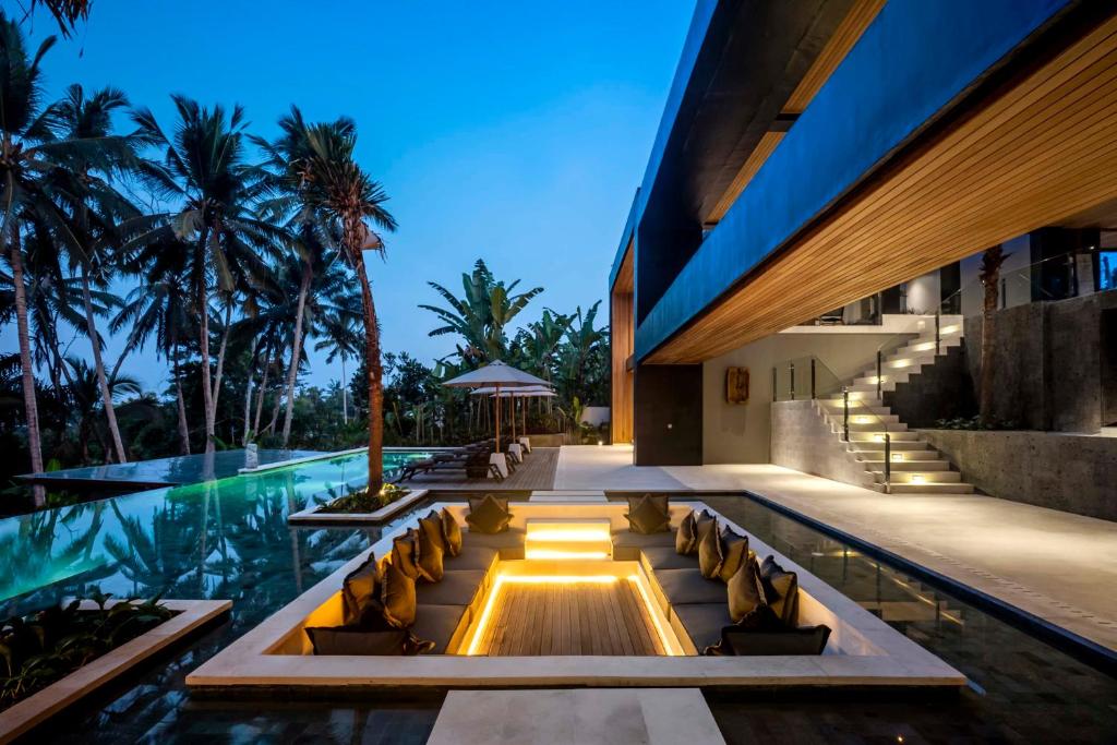 Another beautiful lounge can be found outside: a sunken seat area in the pool is amazing to come together for sunset drinks, relax in between trips or pool sessions and just be happy. The spacious pool offers a view on palm and banana trees, pure nature for your serenity. The private gym room is the ideal place to get some workouts in before you jump in the refreshing pool or have a massage in the private villa massage room.