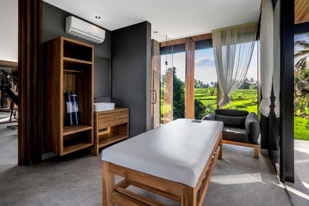 Feel like never before in this super stylish Villa Rice Home. Just outside of famous Ubud yet surrounded by nature and offering all you need for your holiday. 6 bedrooms, fully equipped kitchen, spacious living area, an amazing infinity pool, gym, massage room and the most beautiful nature view, what else could you ask for. This modern villa is built on 2 storeys, designed with a modern interior and traditional details.
