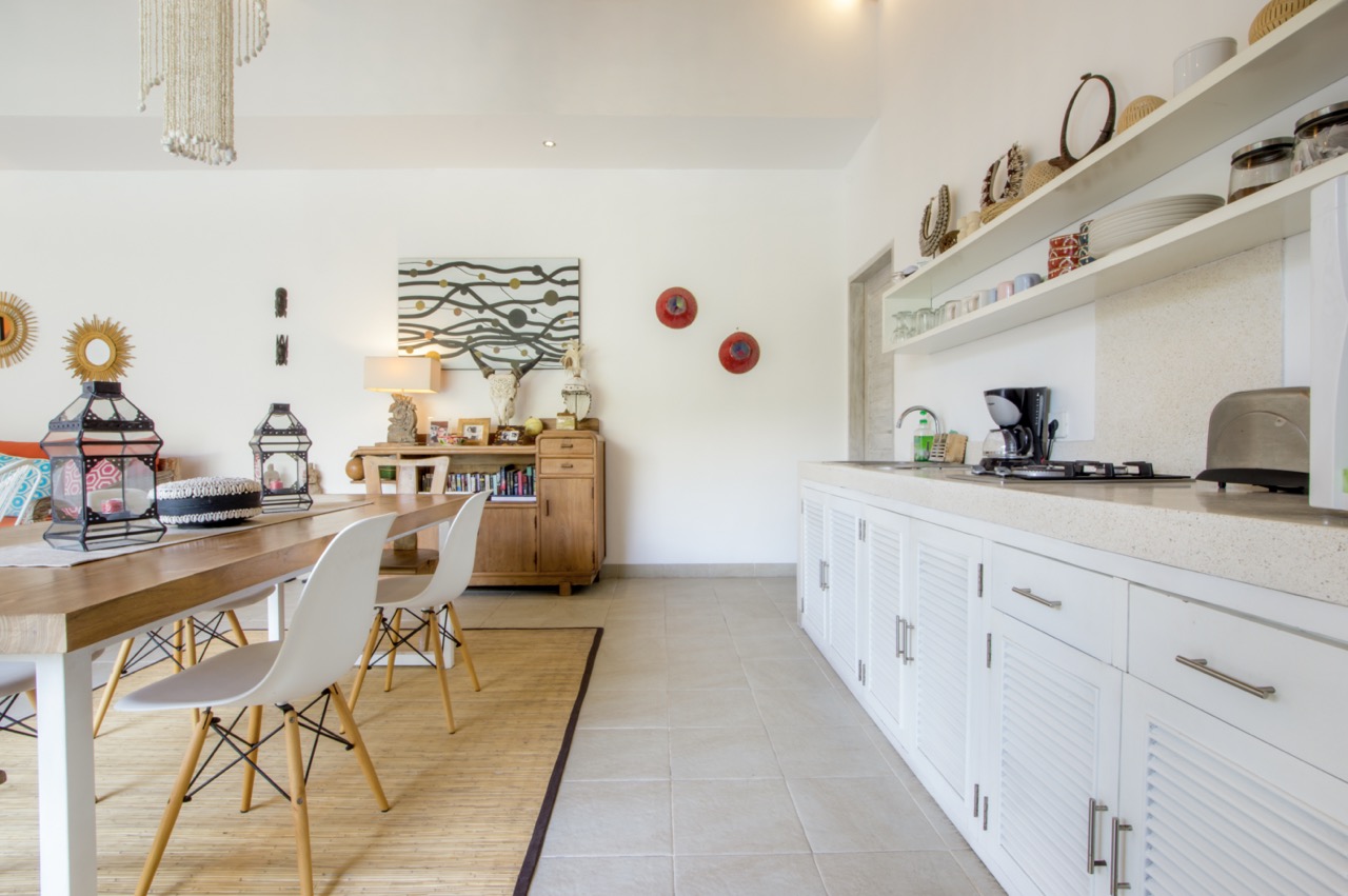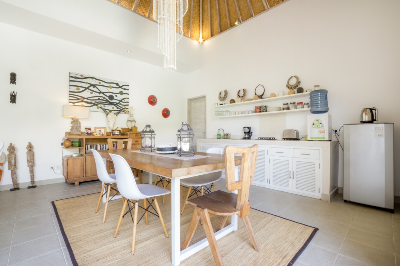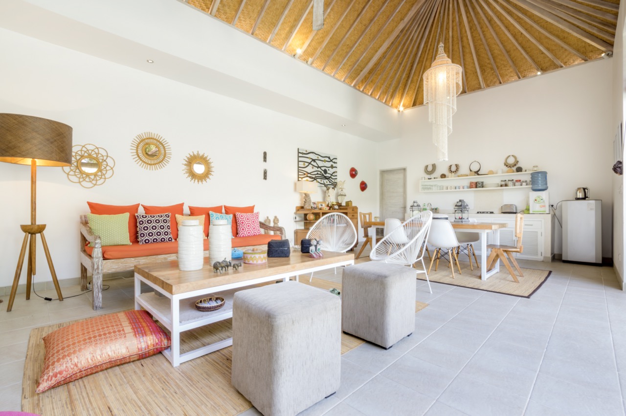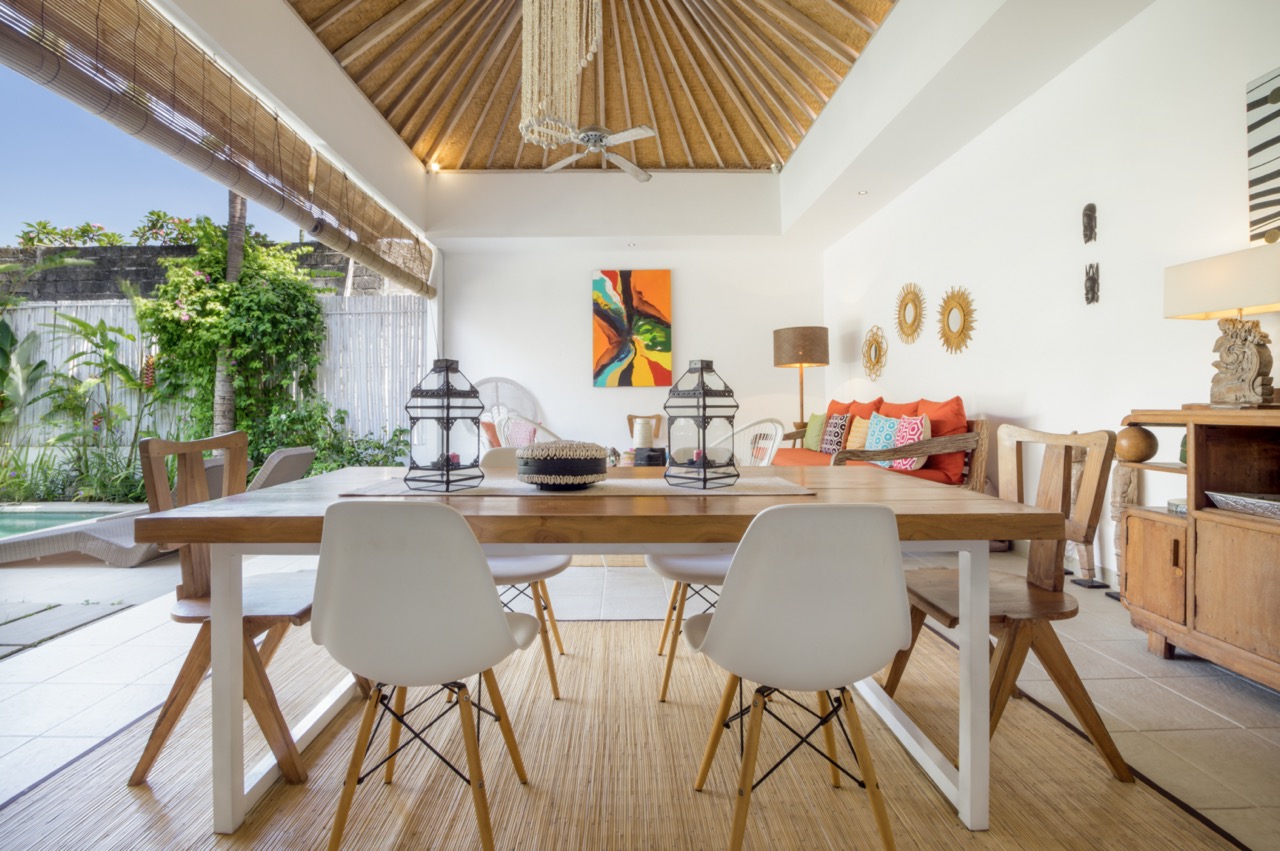 A private swimming pool sparkles in the middle, allowing guests to swim, sunbathe and relax all day long in their private slice of paradise. The living pavilion has a wonderful open-plan design, embracing the tropical lifestyle and giving easy access to the swimming pool. Beneath the high soaring traditional rooftop, the interior design of the living room is ruled by bright colors, artwork and custom Balinese furniture. On one side sits a comfy, cozy lounge corner featuring a Balinese sofa, a leather chair and a unique kings chair, all tucked with bright colored pillows. This makes the perfect place to sit together, enjoying drinks, reading a book or watching TV in the evening. Meals are enjoyed at the handsome teak dining table for six and the kitchen is well-equipped for ultimate convenience in your home on Bali island.