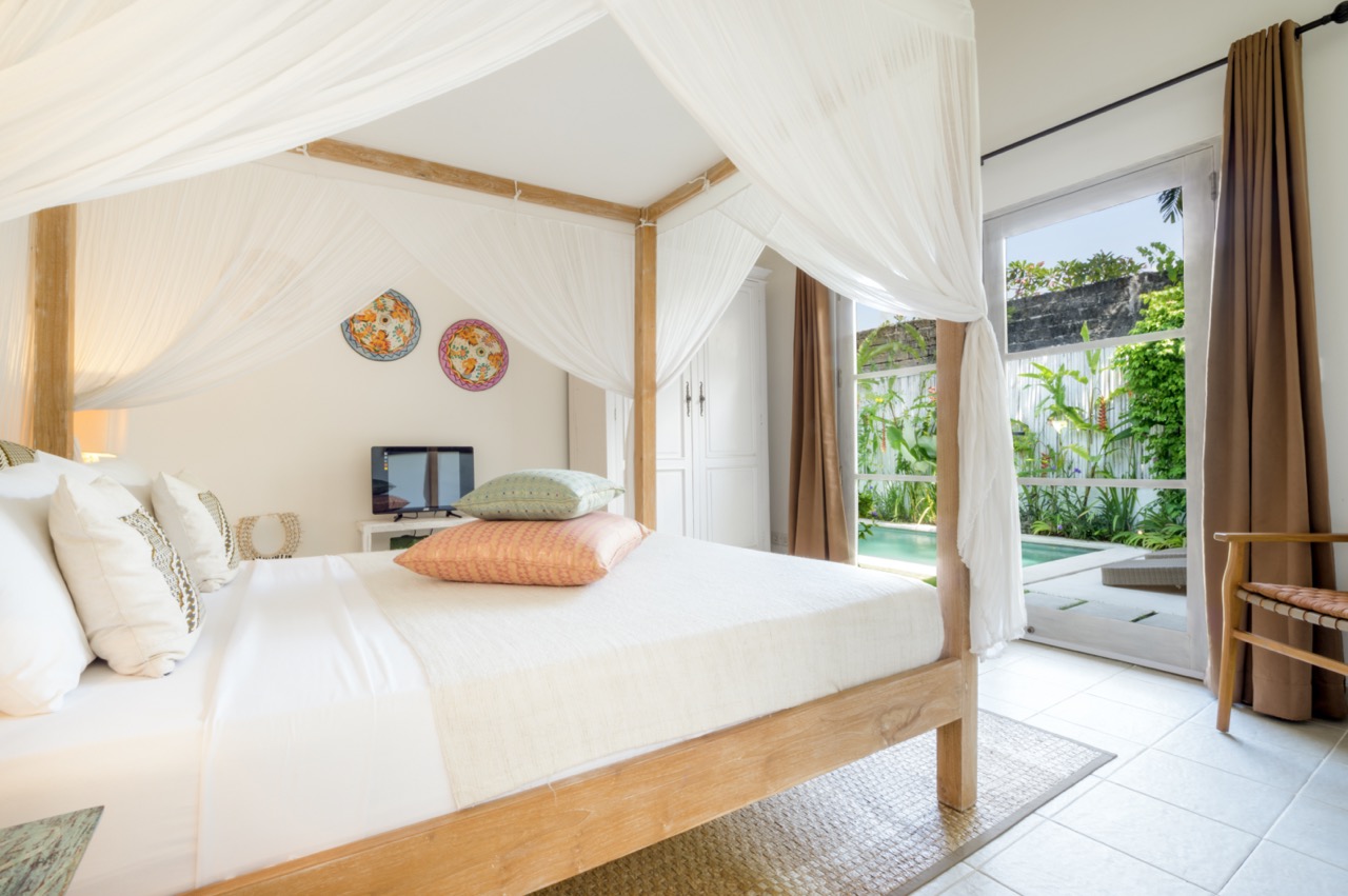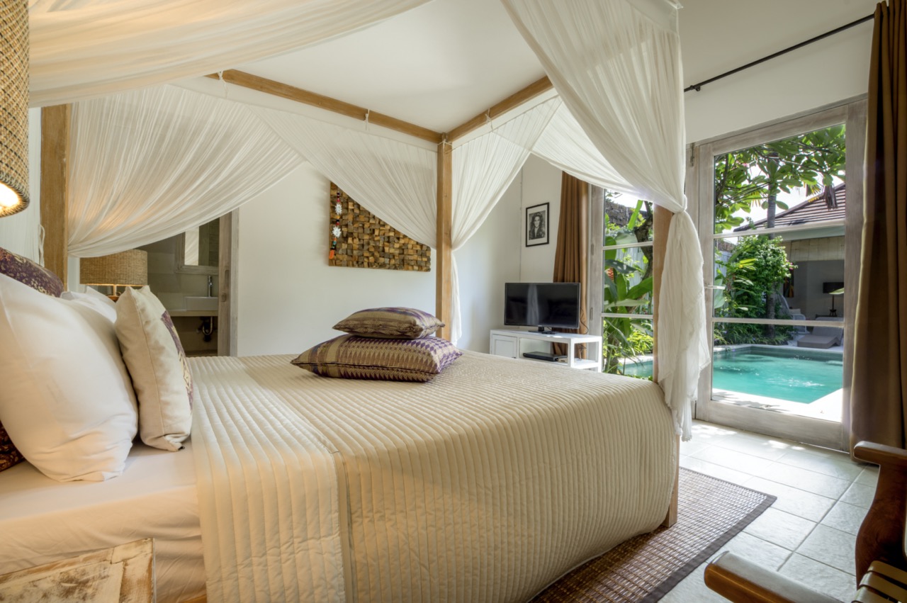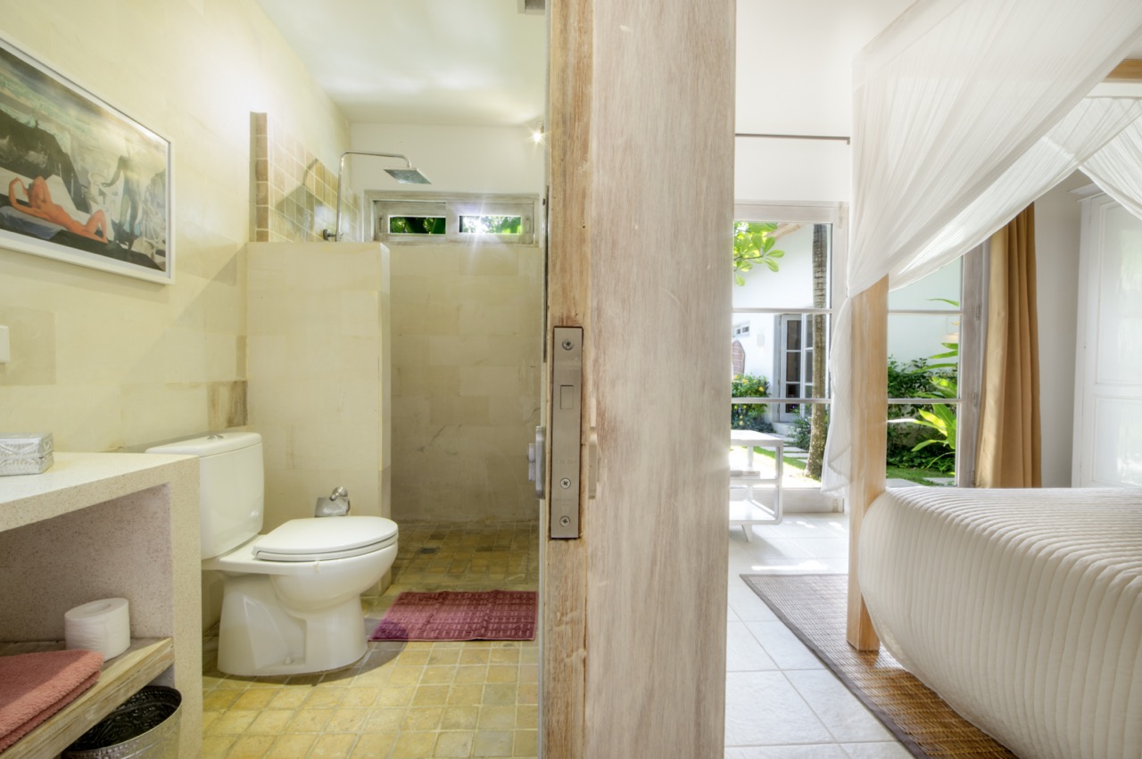 Villa Tara features three private villa suites for guests to retreat to at night. The master room sits in a private pavilion facing the garden and swimming pool. This fully air-conditioned bedroom comes with an airy, high soaring rooftop and a stunning four poster king-size bed draped in a white mosquito net. The en-suite bathroom features a relaxing monsoon shower, a washbasin and W.C. Green plants add to the tropical feel of your showering experience. After a hot shower, you can wear the fresh kimono’s that are awaiting you in the wardrobe closet.