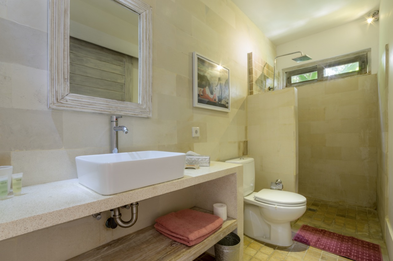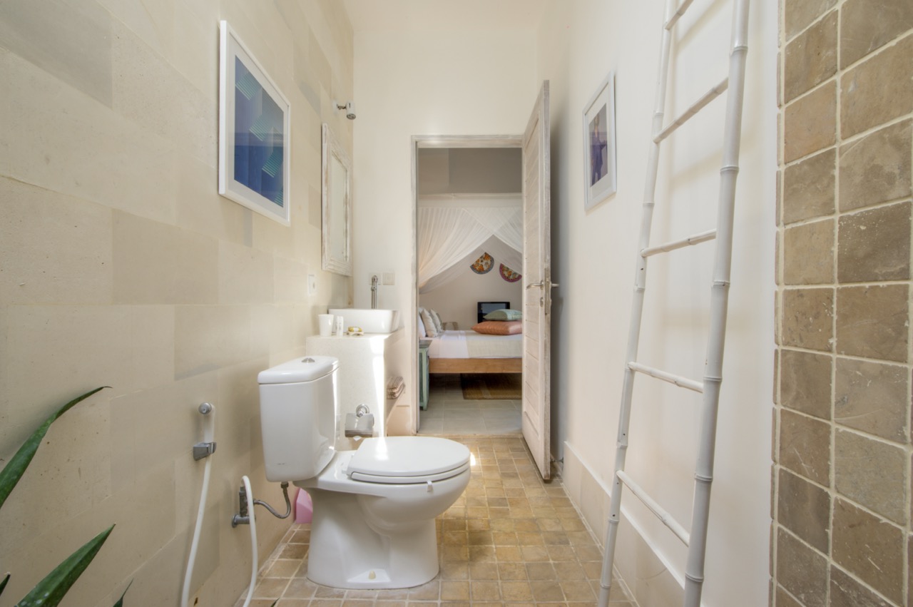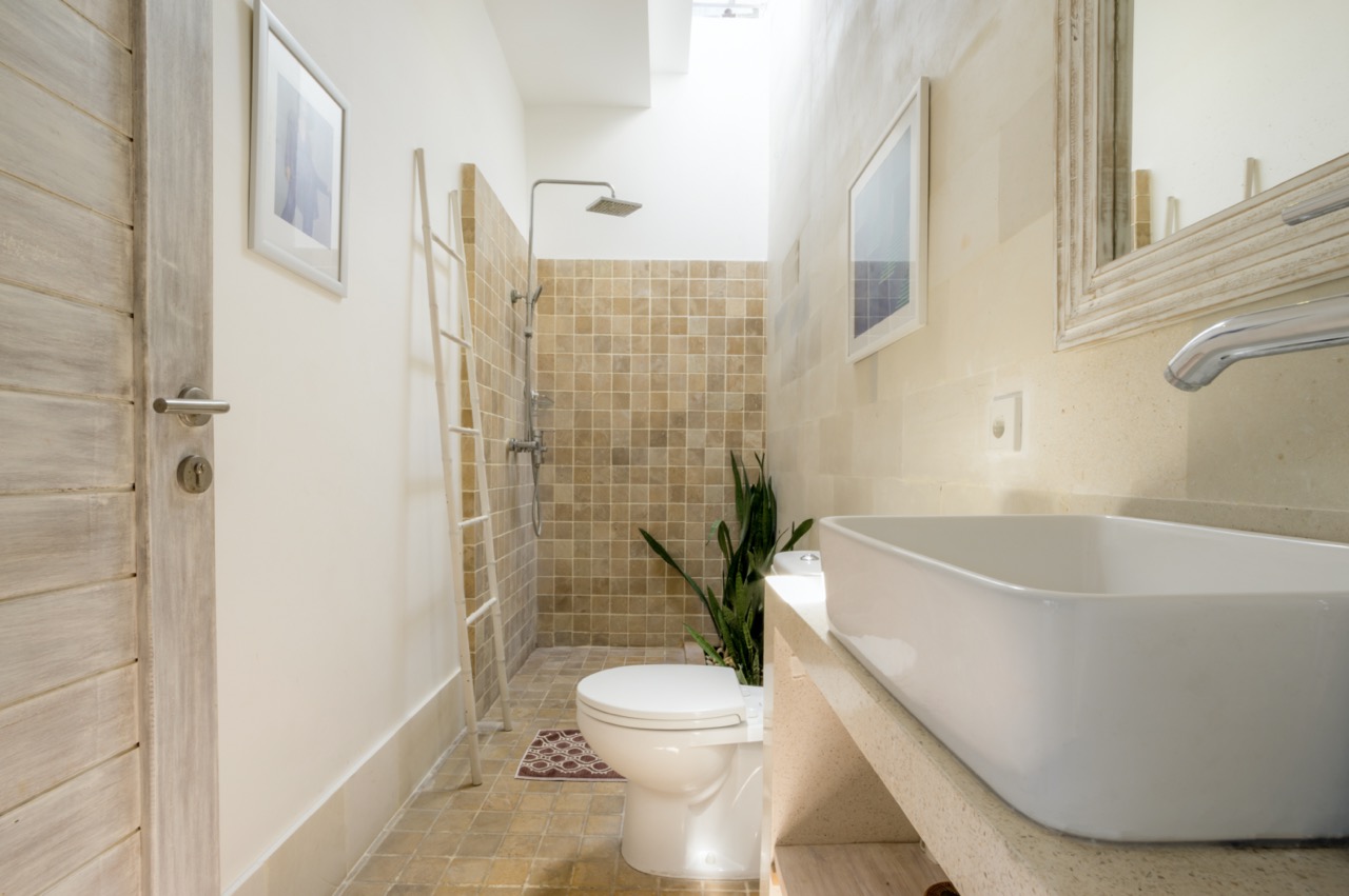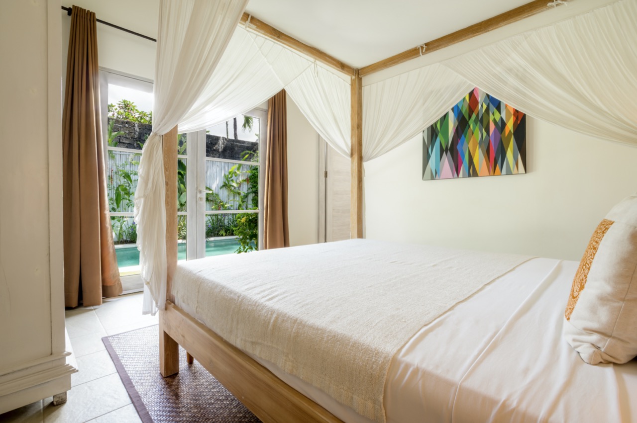 Villa Tara features three private villa suites for guests to retreat to at night. The master room sits in a private pavilion facing the garden and swimming pool. This fully air-conditioned bedroom comes with an airy, high soaring rooftop and a stunning four poster king-size bed draped in a white mosquito net. The en-suite bathroom features a relaxing monsoon shower, a washbasin and W.C. Green plants add to the tropical feel of your showering experience. After a hot shower, you can wear the fresh kimono’s that are awaiting you in the wardrobe closet.