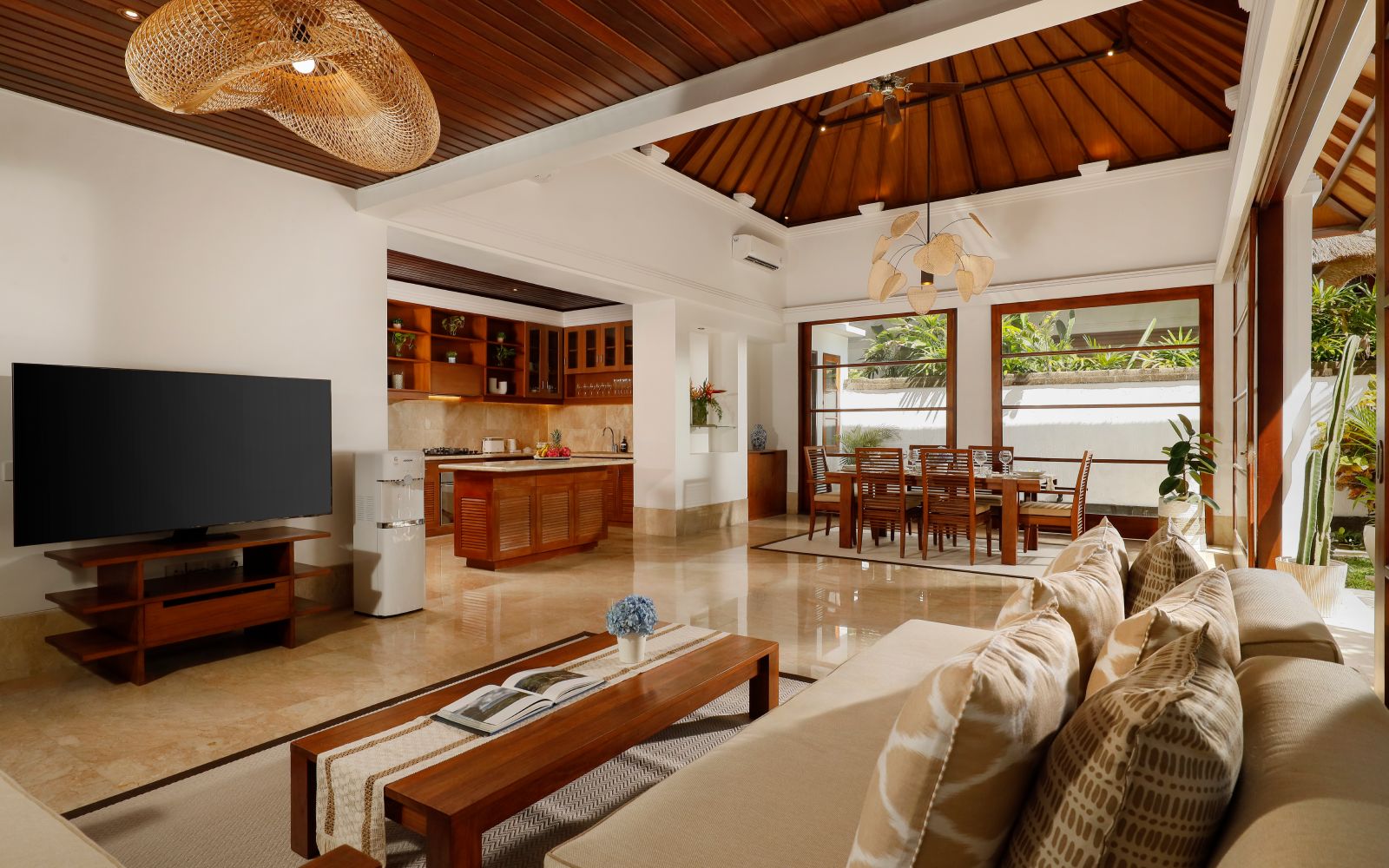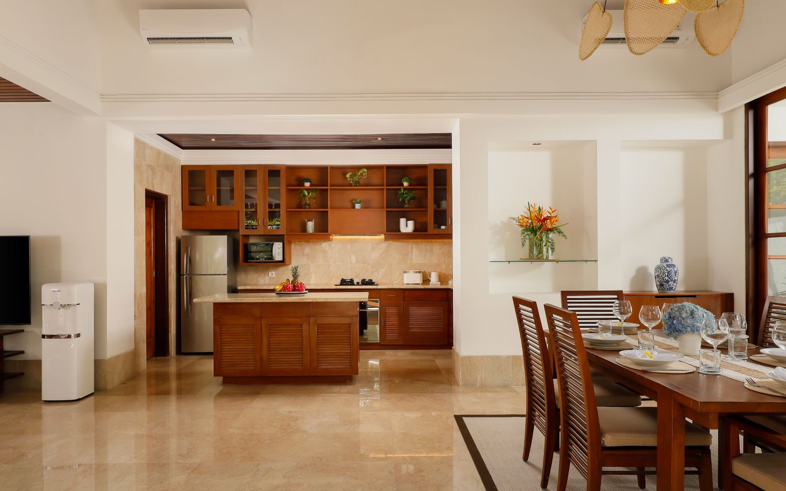 Step into the heart of Villa Avaya’s boho-chic living room, where comfort meets style in a harmonious dance of design. The sofa area, adorned in a soothing beige and white palette, beckons for moments of relaxation and conversation. Adjacent to this cozy haven is a kitchen that seamlessly blends rustic charm and modern elegance. Gather around the eight-seater wooden dining table, an inviting space where every meal becomes a shared experience. Villa Avaya’s living room and kitchen exude an effortless fusion of bohemian charm and contemporary sophistication, creating a captivating retreat within this Balinese haven.